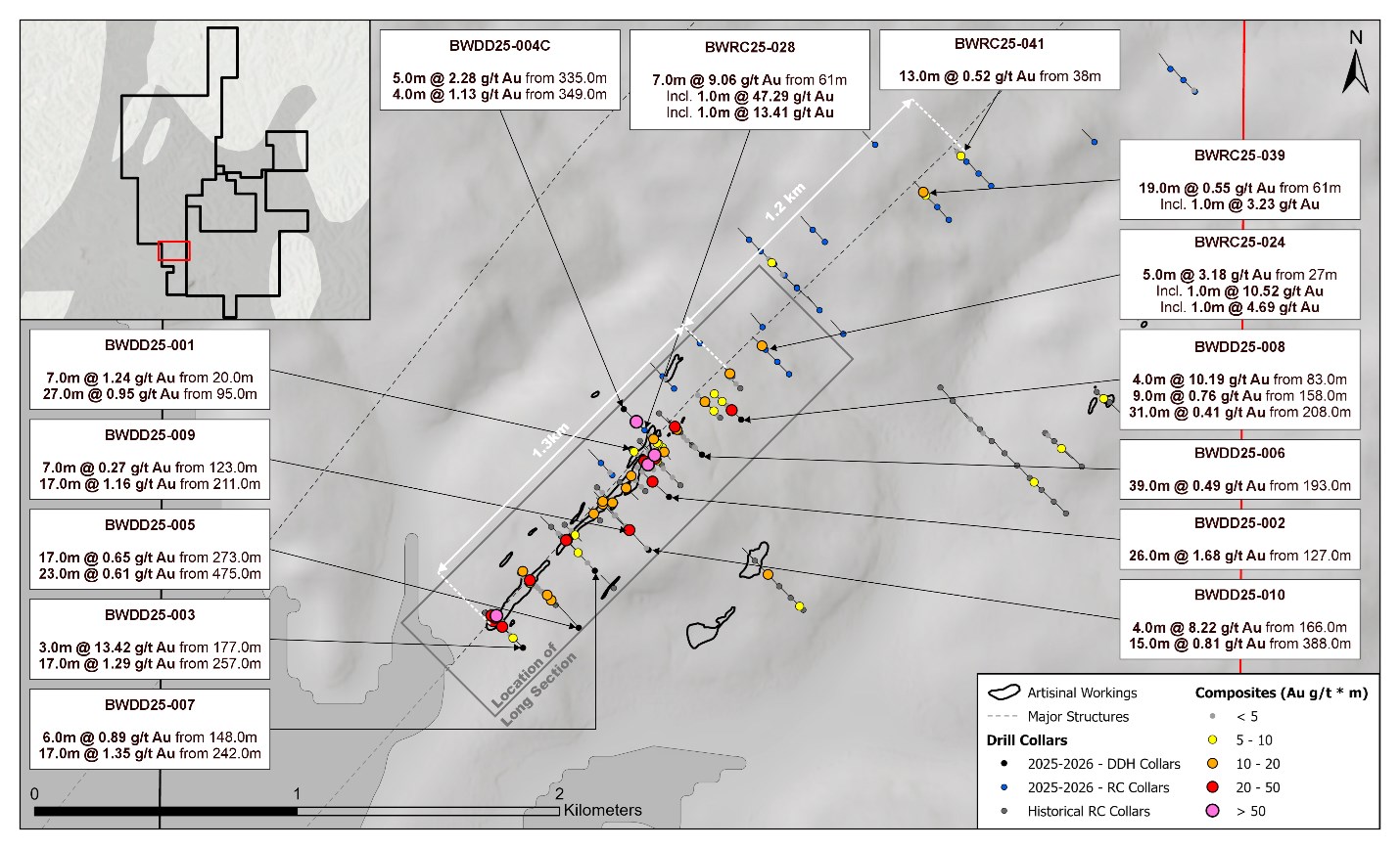 - BWDD25-007: 14.0m at 1.59 g/t Au from 245.0m, including 4.0m at 3.13 g/t Au