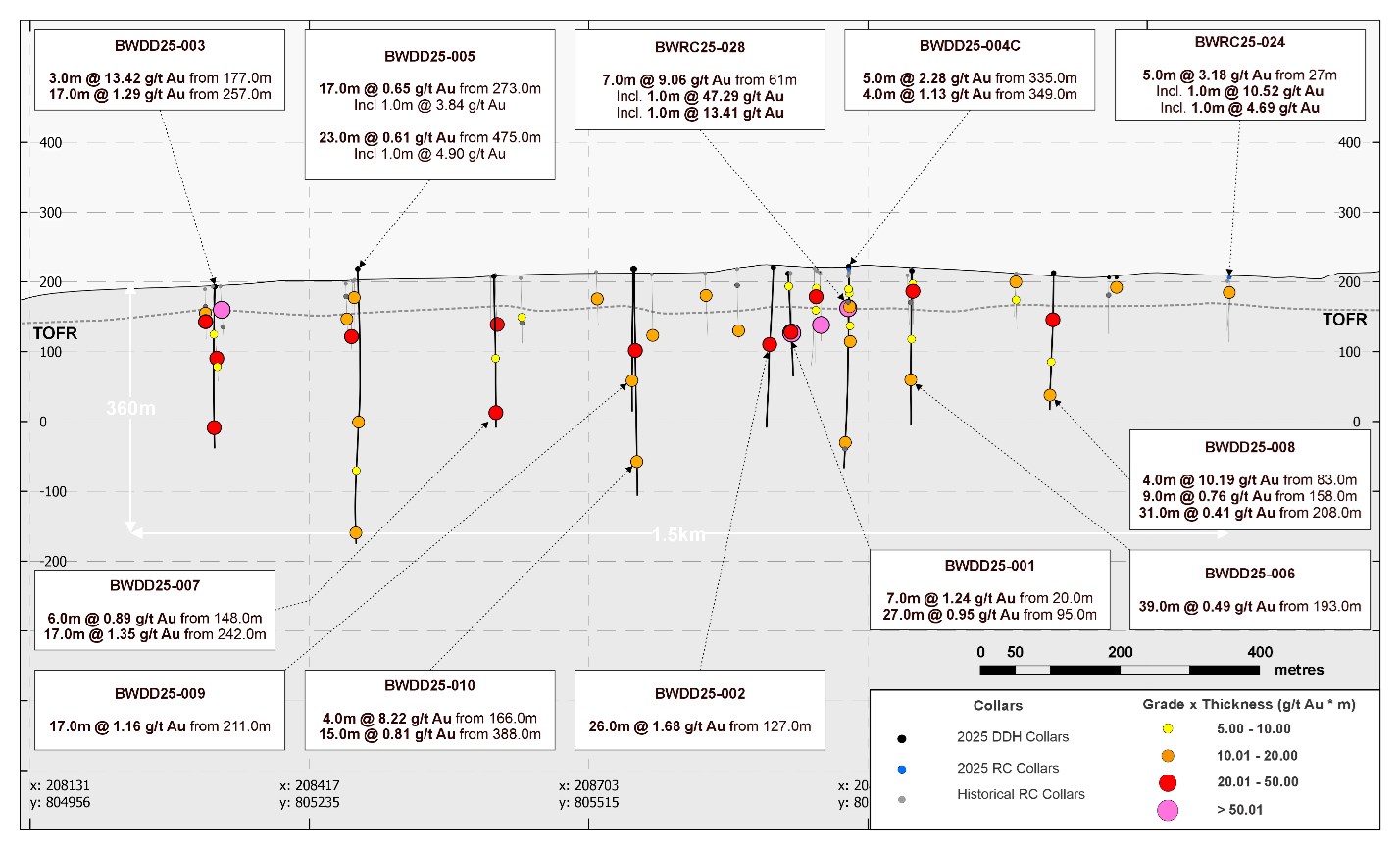 - BWDD25-003: 17.0m at 1.29 g/t Au from 257.0m, including 3.0m at 3.82 g/t Au
