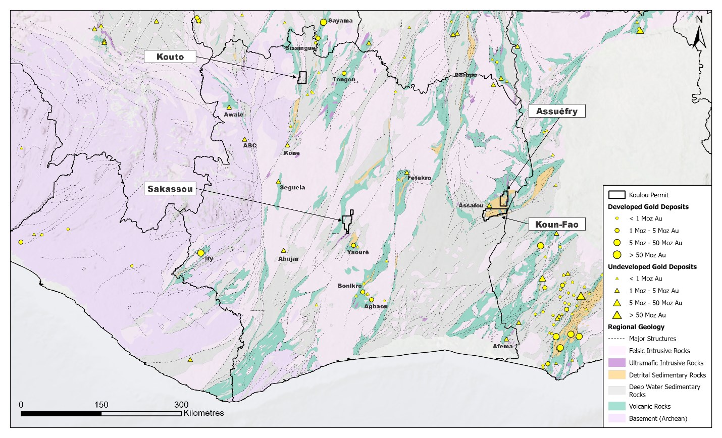 Figure 4. Regional geology with significant gold deposits, and Koulou project locations