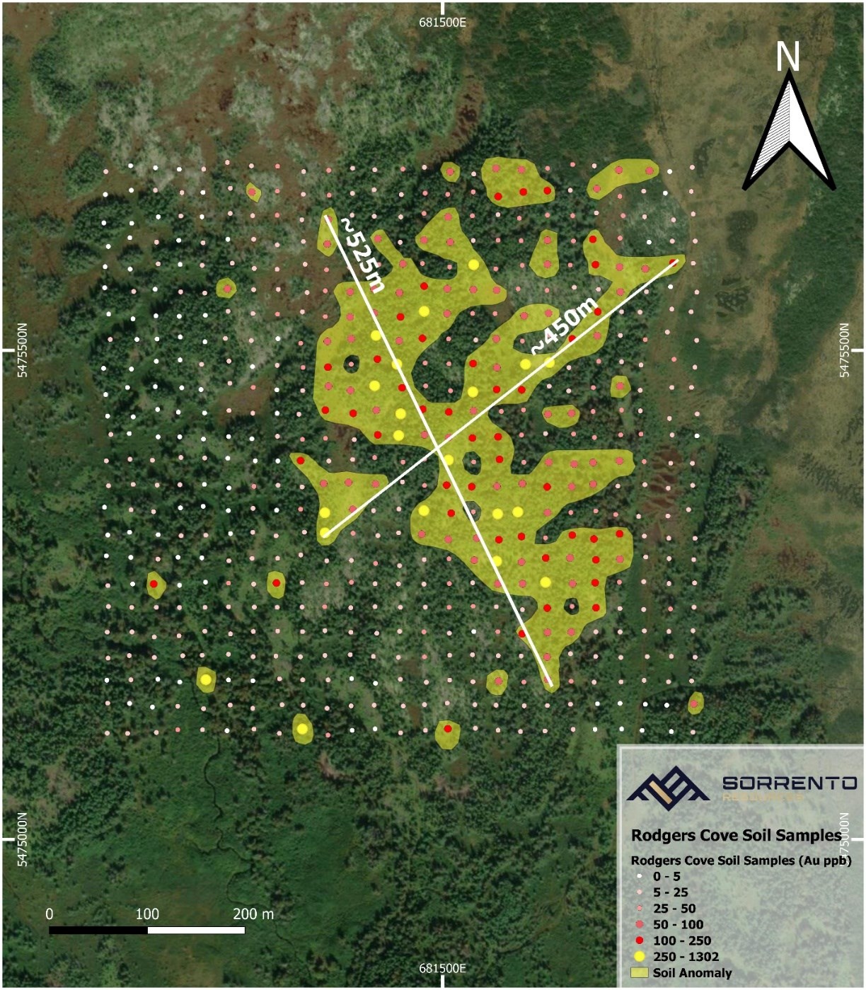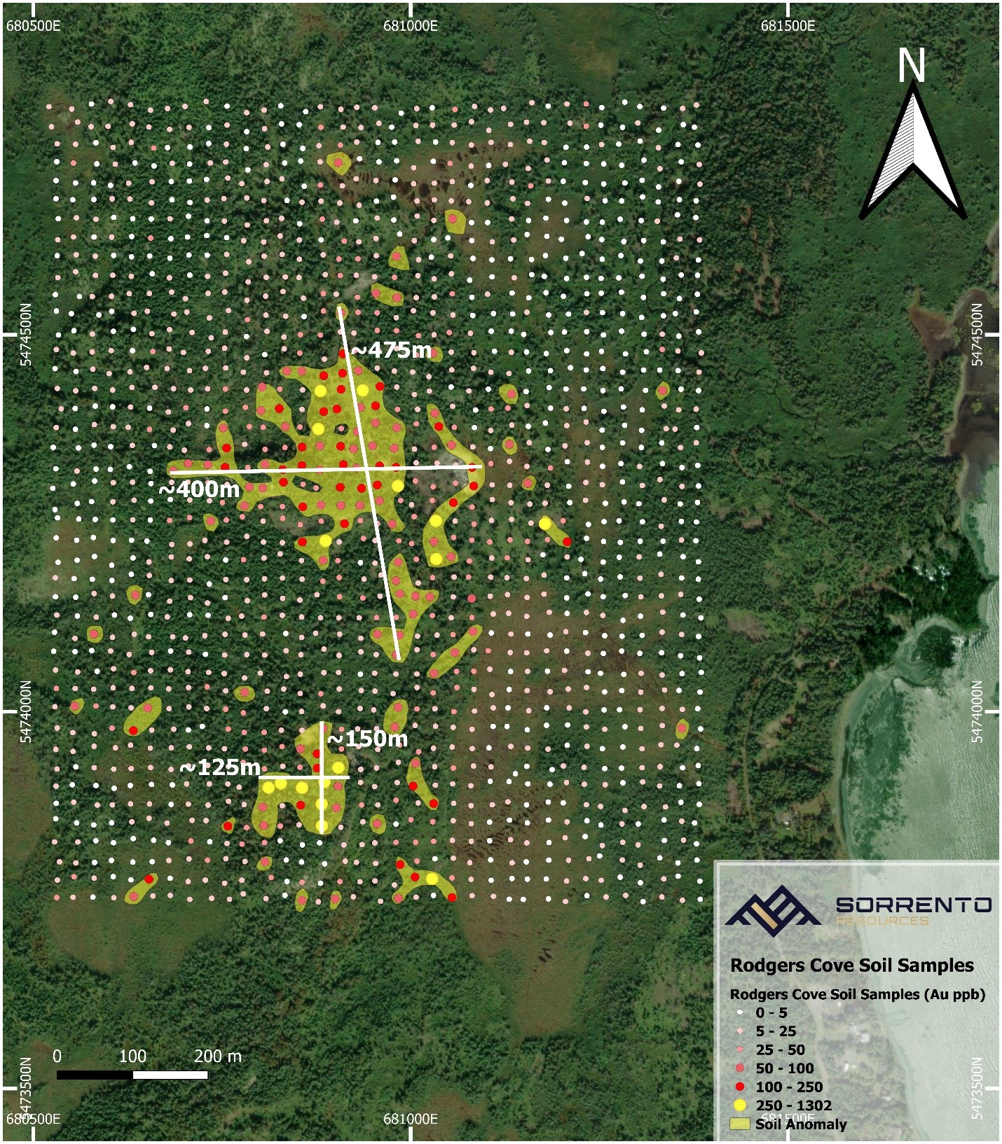 Alex Bugden, P. Geo., President, CEO, and Qualified Person of Sorrento Resources Ltd., commented, "The identification of multiple large-scale and high-grade soil anomalies at Rodgers Cove significantly enhances the Project's potential. The SG1 anomaly demonstrates strong gold-in-soil continuity, and combined with the historic trench result of 115.6 g/t gold over one metre, this represents a compelling drill ready target.