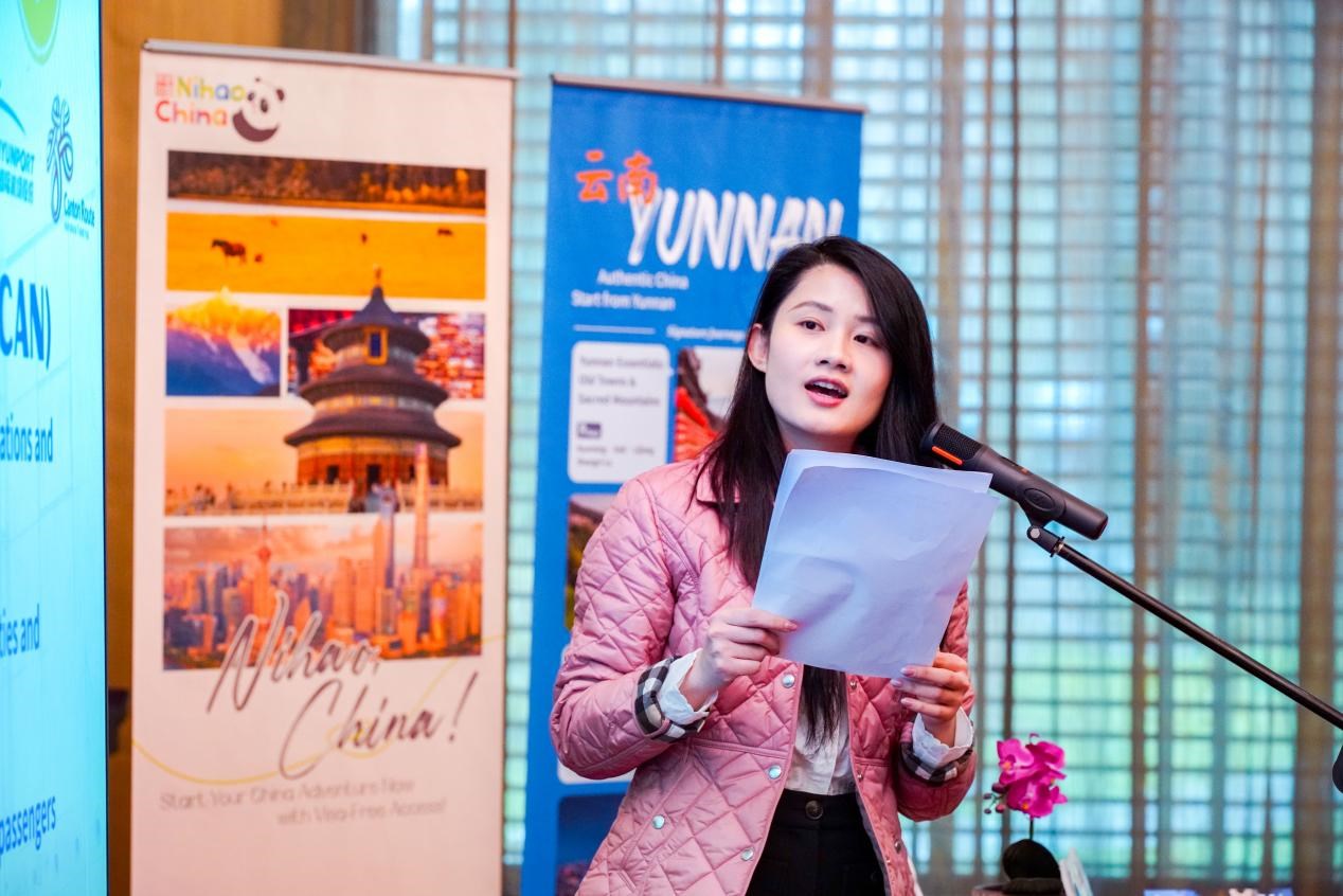 (Luo Ying, Regional Sales Manager of the Europe Marketing Center of China Southern Airlines, introduces the airline's routes and services supporting the development of China's inbound tourism.)