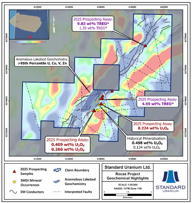Figure 2. Summary map showing EM conductor trends on the Rocas project and highlighting anomalous uranium and REE occurrences across the Project.2