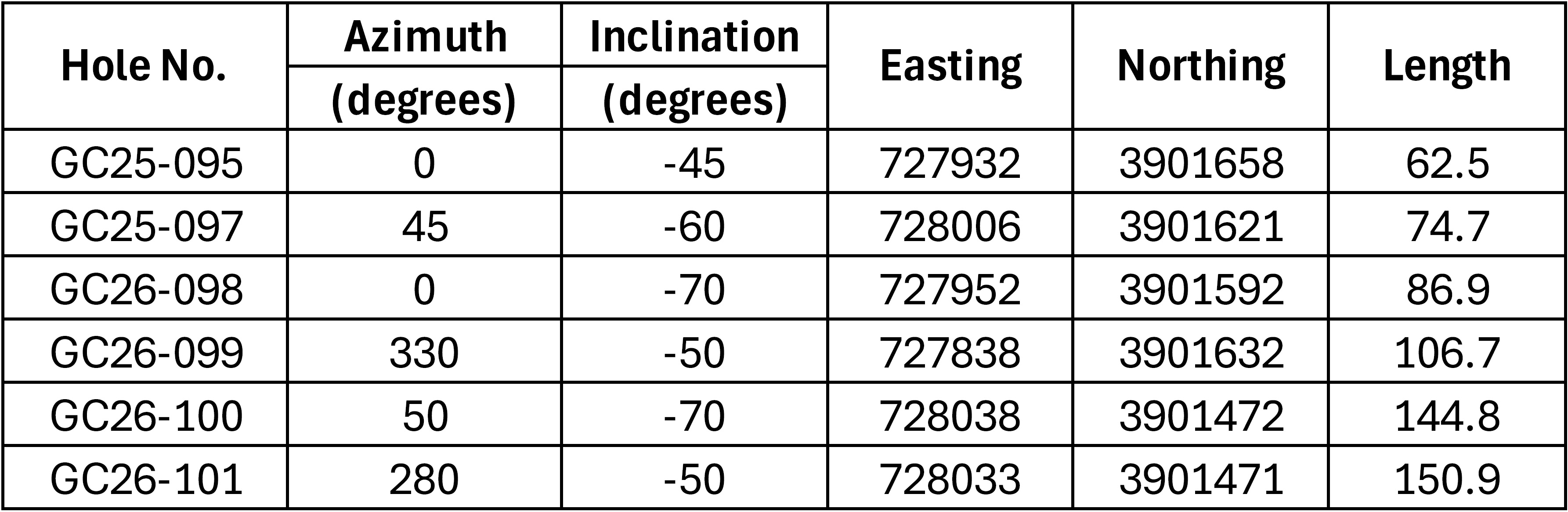 The geologic section provided in Figure 3 reveals a sub-horizontal 'blanket' of quartz-calcite breccia and veins at shallow depths. Hole GC26-95 contains 36.6m of 1.04 g/t Au and GC26-98 intersected 21.3m of 0.92 g/t Au. It appears that the holes closest to the intersection of the 'Black Dyke' breccia and the suspected NE-trending structure are thicker and point to the importance of this structural intersection. The southward continuation of this mineralized zone is likely and supported by the projection of mineralized, regional structures (Roadside Mine fault) and hydrothermal alteration in the overlying volcanics (Figure 1).