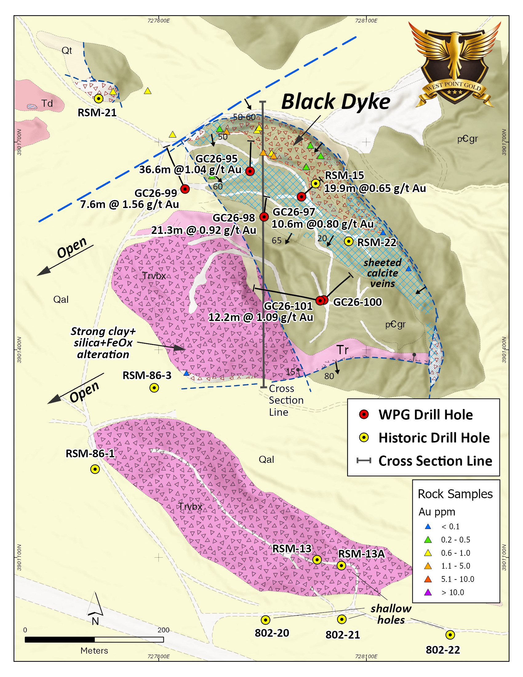 "Black Dyke is now a potential second resource development area at Gold Chain, which is a meaningful milestone for the project. Shallow, oxidized gold from the surface, with the zone open in multiple directions, gives us a well-defined path to expand this target. Equally compelling is that West Point Gold found this by applying modern methods to a historically underexplored prospect, and the Company is taking that same approach across the property. With results pending from multiple step-out targets, it appears that the potential of the Gold Chain Project is still being defined," stated Derek Macpherson, President and CEO.