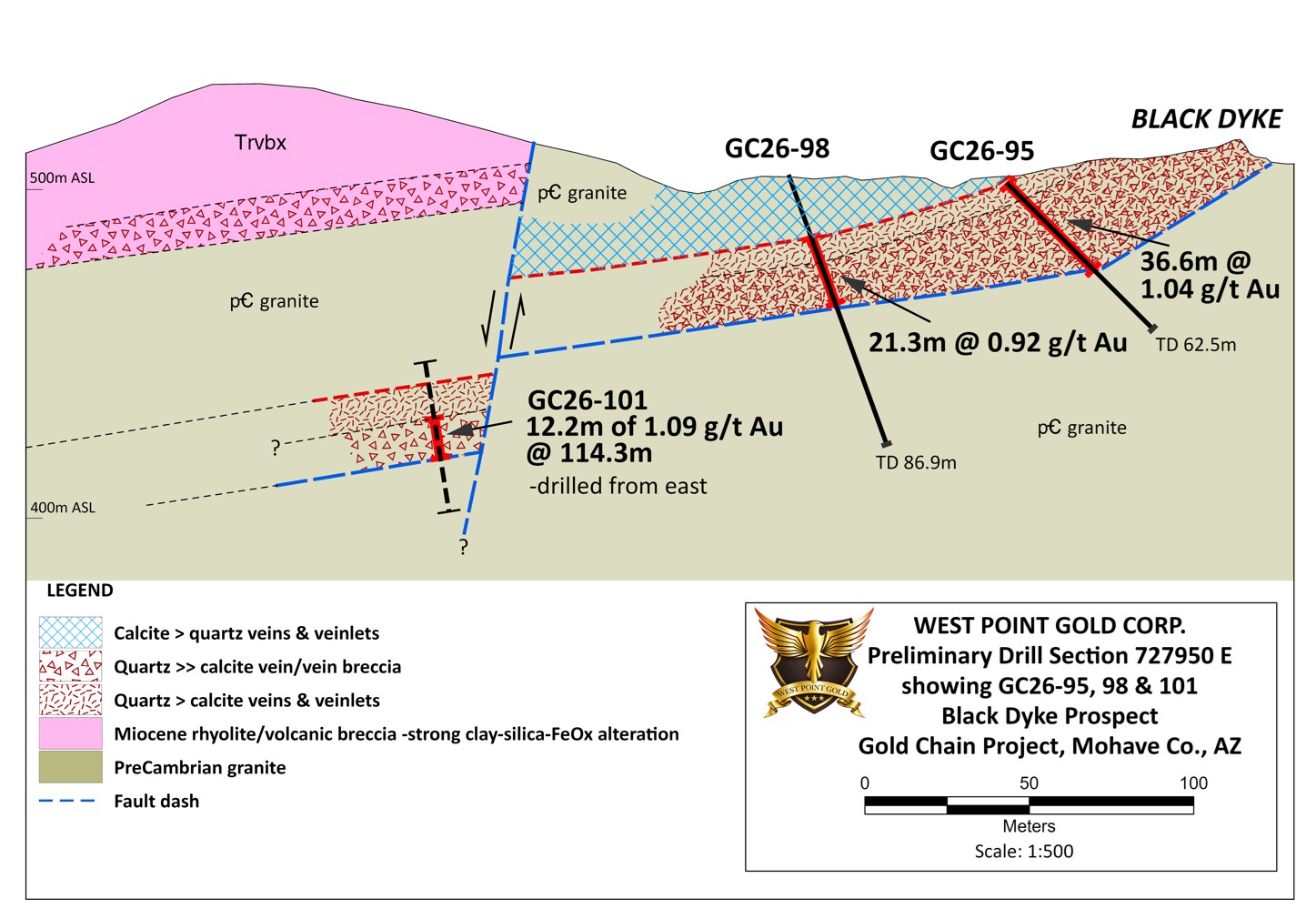 Vancouver, British Columbia--(Newsfile Corp. - March 17, 2026) - West Point Gold Corp. (TSXV: WPG) (OTCQB: WPGCF) (FSE: LRA0) ("West Point Gold" or the "Company") is pleased to announce the intersection of shallow gold mineralization at the Black Dyke target located four kilometres ("km") west of the Tyro Main Zone, at the Company's Gold Chain Project in Arizona. The initial six reverse circulation ("RC") drill holes at Black Dyke, suggest it is a highly prospective area where additional resources could be defined at the Gold Chain Project. Recent drilling results from the Black Dyke prospect have further prioritized the target for follow-up drilling in early 2026. To date, 10,255m of the ongoing 15,000m drill program at the Gold Chain project have been completed. Results are pending for 24 holes representing 5,361m from the Tyro Main Zone, South Tyro, Sheep Trail, and Bull 8 targets.