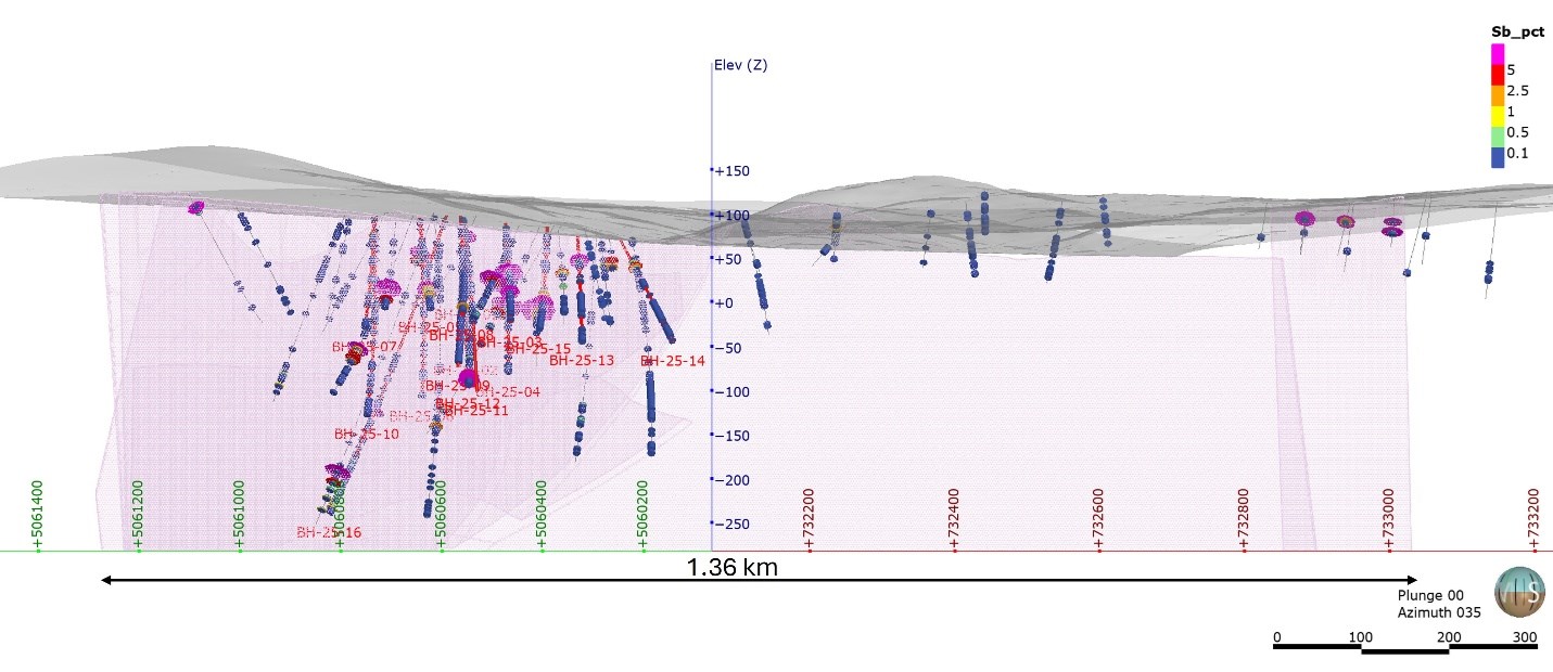 - Drilling has outlined an antimony deposit in the Main Zone over 700 meters long and to a depth of at least 350 meters