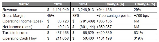 The Company delivered an $850,357 positive earnings swing, reversing a $(801,144) net loss in 2024 to net income of $49,213 in 2025.