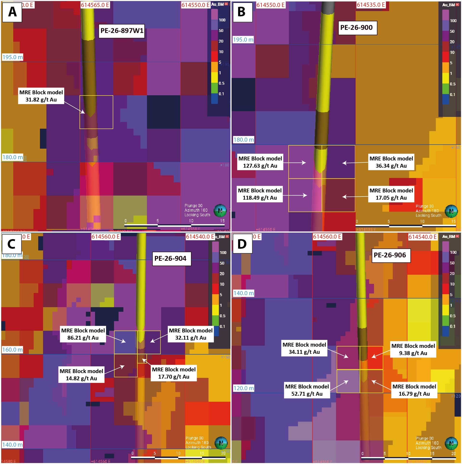 Figure 3: Screenshot from Perron Leapfrog Geo project showing the intercepts of grade control holes into the existing block model: A) PE-26-897W1 with assay results of up to 77.10 g/t Au; B) PE-26-900 with assay results of up to 200.80 g/t Au; C) PE-26-904 with assay results of up to 51.96 g/t Au; D) PE-26-906 with assay results of up to 27.00 g/t Au.