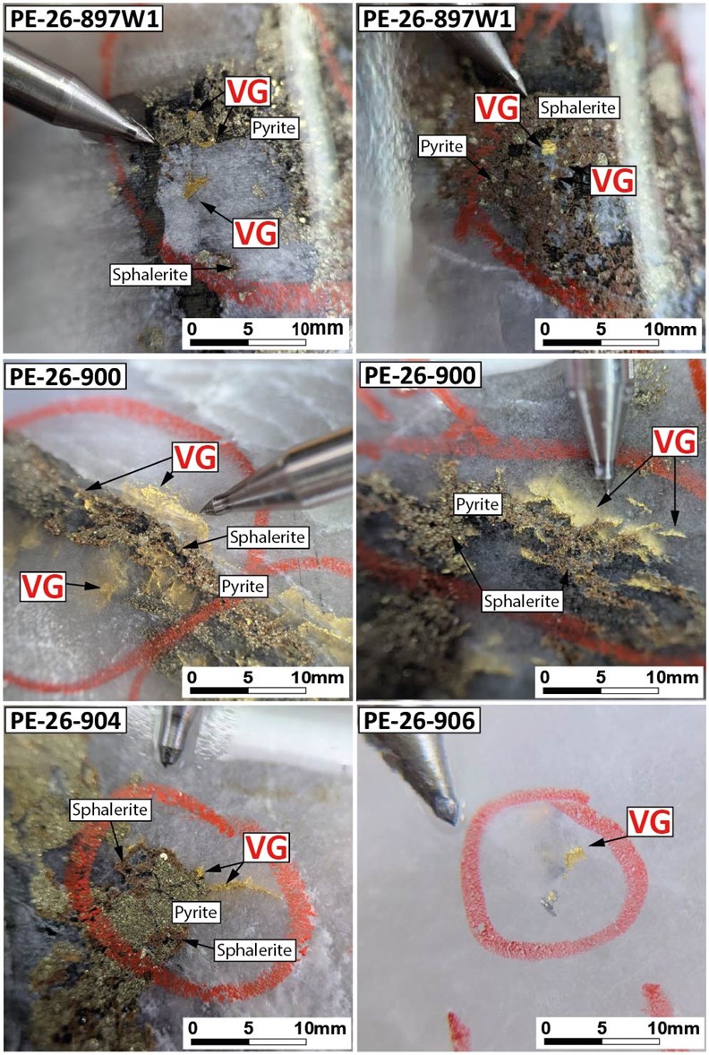 Figure 4: Photos of visible gold in the Champagne Zone from drill holes PE-26-897W1, PE-26-900, PE-26-904 and PE-26-906. Mineralization is represented by gold bearing quartz-carbonate-sulfide veins with visible gold hosted in the aphanitic Beaupré rhyolite. Abbreviation: VG - Visible Gold.
