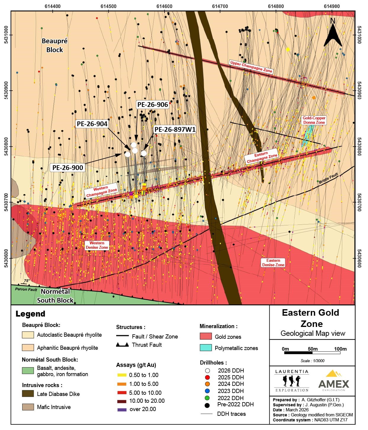 Montréal, Québec--(Newsfile Corp. - 31 mars 2026) - Amex Exploration Inc. (TSXV: AMX) (FSE: MX0) (OTCQX: AMXEF) (« Amex » ou « la Société ») est heureuse d'annoncer le dernier lot de résultats du programme de contrôle de teneur conçu pour l'échantillon en vrac (« échantillon en vrac » ou « vrac ») de la Champagne Zone (voir figures 1 à 3). Les résultats du programme sont positifs et ont permis de resserrer la maille d'échantillonnage dans les chantiers sélectionnés pour le vrac. La Société procédera maintenant à la mise à jour des modèles géologiques et du modèle de blocs dans la zone de l'échantillon en vrac, ce qui permettra aux ingénieurs miniers d'affiner la conception des chantiers sélectionnés. Voir le tableau 1 pour les détails des résultats, le tableau 2 pour les coordonnées des trous de forage et la figure 4 pour des photos de minéralisation aurifère visible dans les forages annoncés aujourd'hui.