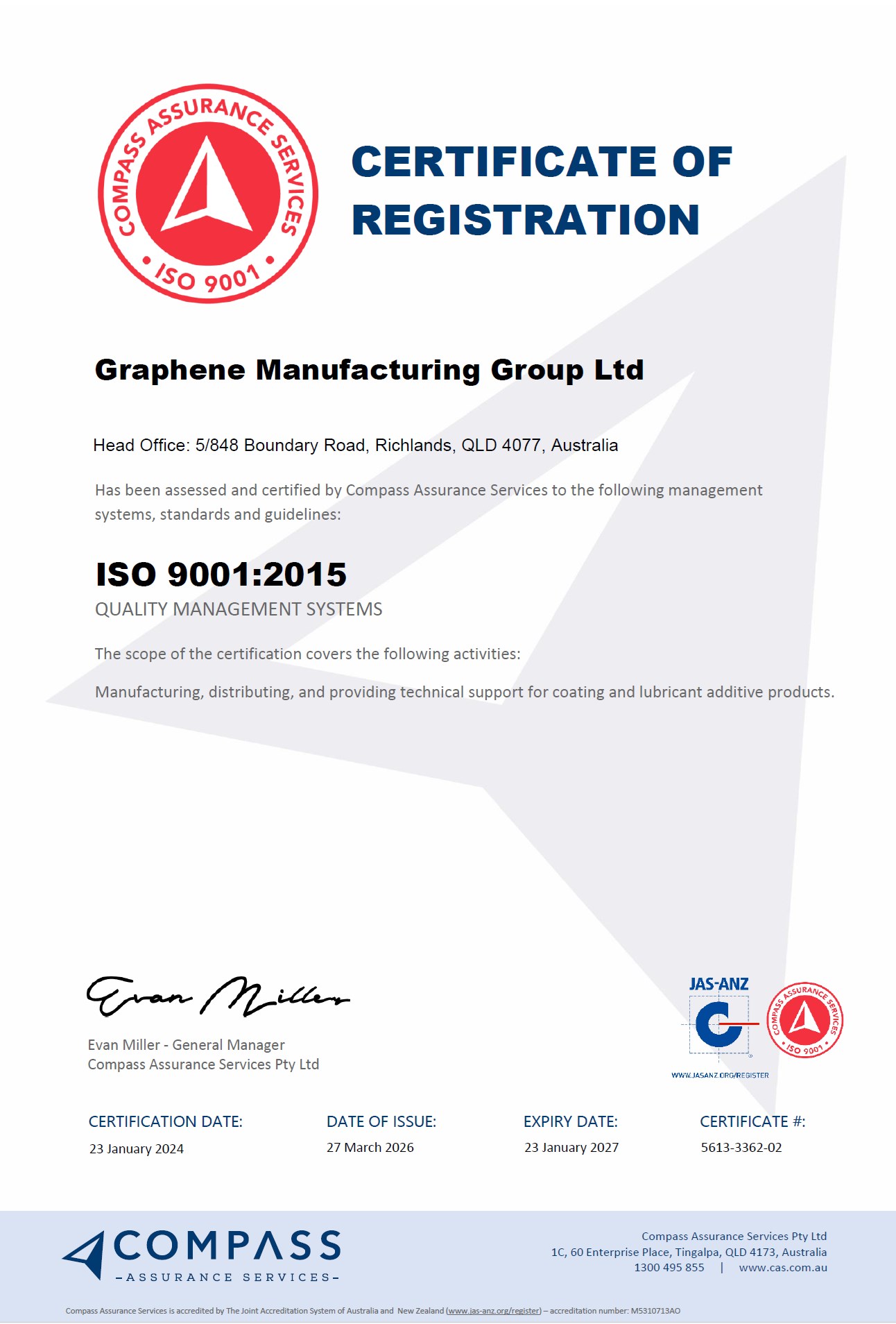 The Company is also pleased to announce it has successfully passed another ISO9001:2015 quality audit of the organisation for the manufacturing, distributing, and providing technical support for the Company's graphene coating and lubricant additive products. Figure 1 shows the certificate. ISO 9001 is the internationally recognized standard for Quality Management Systems (QMS). It provides a framework for organizations to ensure products and services consistently meet customer and regulatory requirements while focusing on continual improvement. It is applicable to any industry or business size, focusing on quality control, efficiency, and risk management.