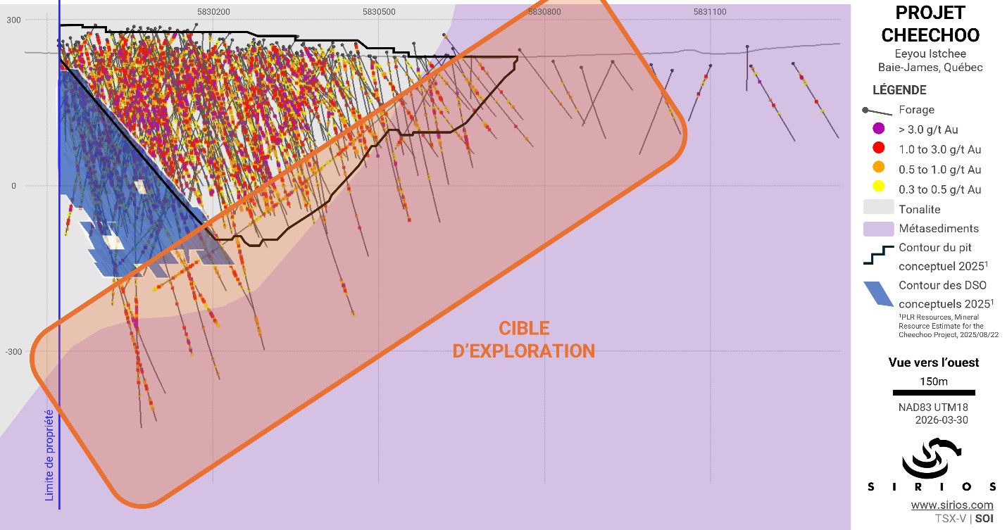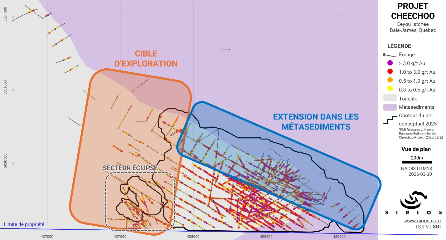 Cheechoo est situé à environ 15 km de la mine Éléonore et à proximité d'infrastructures, notamment des routes et des installations hydroélectriques, dans la région d'Eeyou Istchee Baie-James, au Canada. Cheechoo est au stade de la mise en valeur des ressources, avec 35 Mt de ressources indiquées à 1,12 g/t, soit 1 262 koz, et 42,7 Mt de ressources présumées à 1,23 g/t, soit 1 688 koz. De plus, une cible d'exploration conceptuelle de 31 à 40 millions de tonnes de minéralisation titrant entre 1,27 et 1,45 g/t Au a été estimée. Les lecteurs sont invités à consulter le rapport d'estimation des ressources minérales intitulé « Technical Report On The Cheechoo Project With An Updated Mineral Resource Estimate For The Cheechoo Gold Deposit, Eeyou Istchee James Bay, Quebec, Canada, », daté du 1er juillet 2025 et rédigé par Pierre-Luc Richard de PLR Resources Inc., personne indépendante et qualifiée au sens de la Norme canadienne 43-101. Le rapport technique complet est disponible sur SEDAR+ sous le profil de Sirios, ainsi que sur le site Web de la Société.