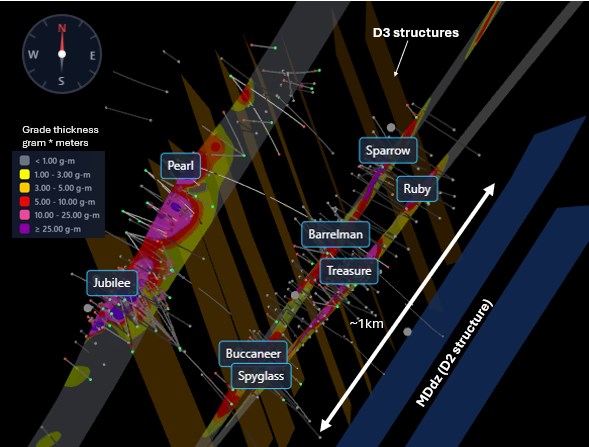 - Drill hole DRG-047 was collared 300 meters south of Barrelman near the historic Big Master Mine and intercepted 3.80 meters grading 13.08 g/t gold, including 1.15 meters of 41.45 g/t gold (Buccaneer).Development of new 3-D figures featuring BM1 and BM2 mineralized structures as grade thickness contoured long sections with D3 structural intersections.