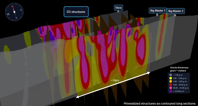 Figure 3: D3 structures with interpreted contoured long sections for the BM1, BM2 and Elora mineralized structures.