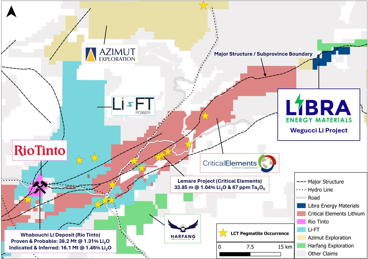 The Wegucci property is situated within the Lac des Montagnes volcanic-sedimentary belt of the Opatica Subprovince in Québec's James Bay region. Covering 2,070 hectares, the Wegucci property occupies a strategic position along the same major structural corridor and subprovince boundary that hosts Rio Tinto's Whabouchi lithium deposit, as well as several other known lithium-cesium-tantalum (LCT) pegmatite occurrences (Figure 2).