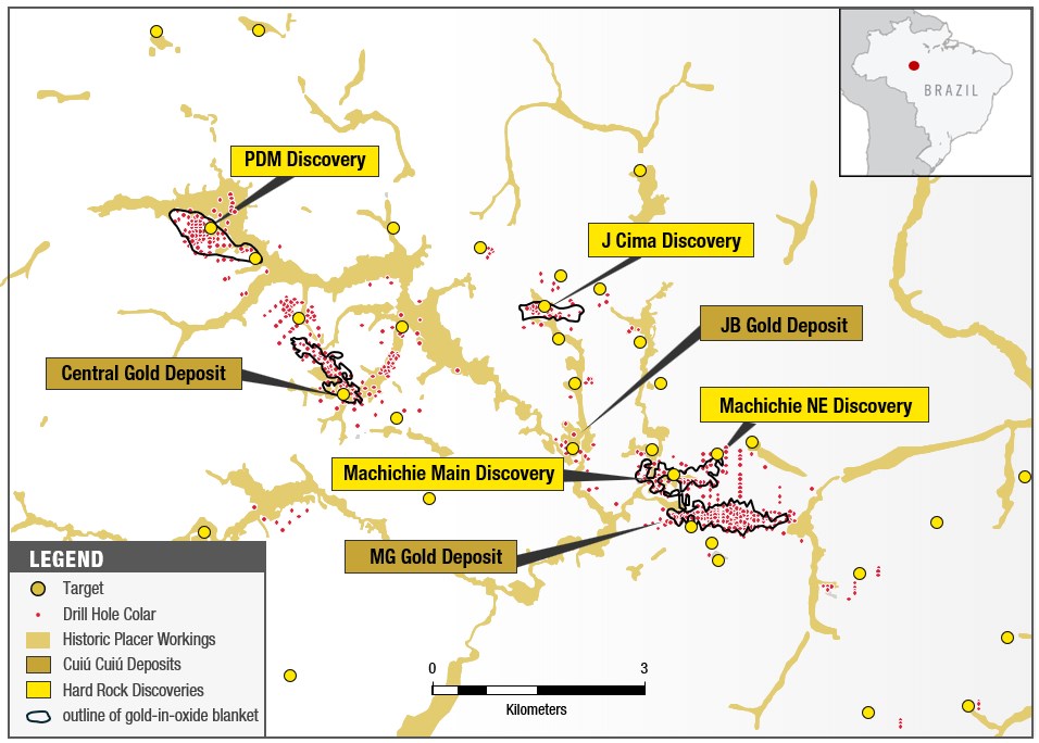 Figure 1: Map showing location of known gold deposits at MG, Central, and JB. The location of new discoveries at PDM, Machichie NE and Machichie Main and Jerimum Cima discovery are also shown.