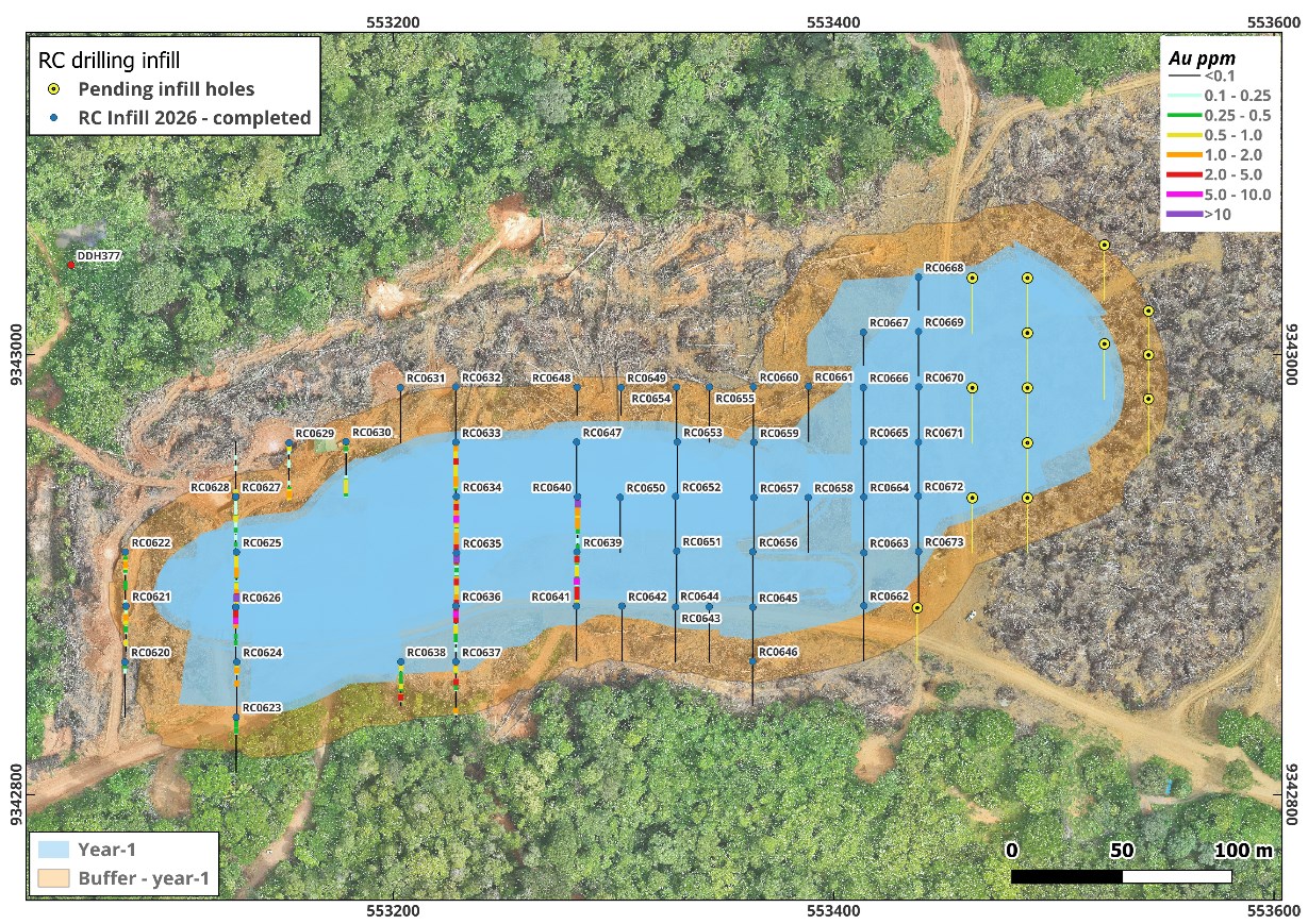 The objective of the ongoing RC infill drill program at MG is to provide greater confidence on the grade and continuity of the current reserve base at MG ahead of mining and to further refine the mine plan that was developed as part of the PFS study release in July 2025 (see press release dated July 29, 2026).