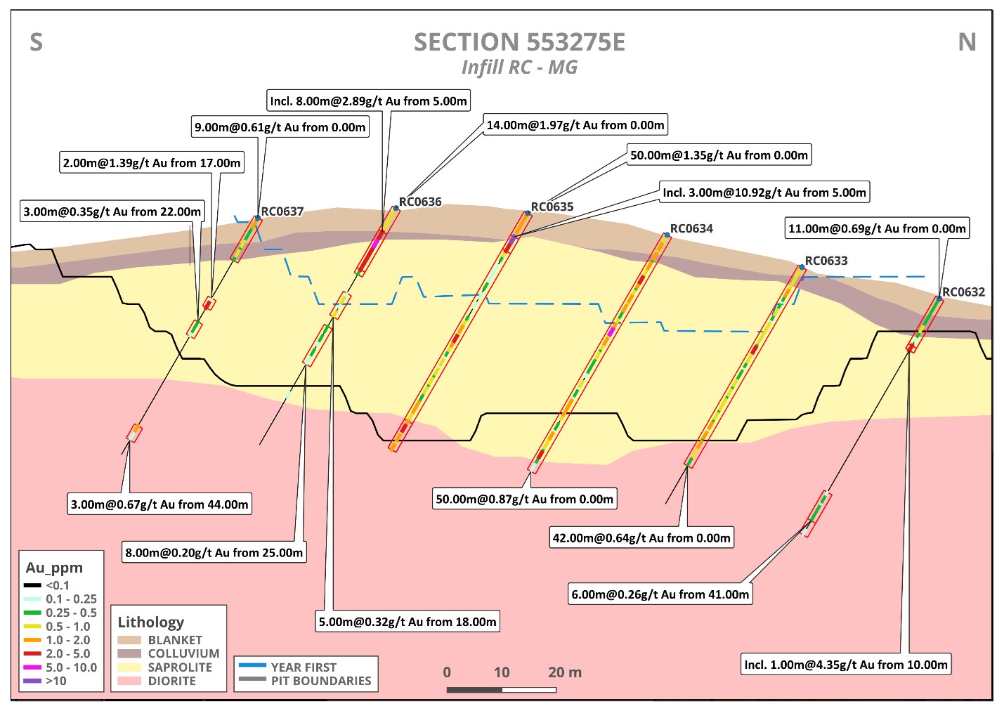 Figure 3. Section 553275E showing the location of RC infill drillholes RC632 to RC637 at the MG gold deposit.