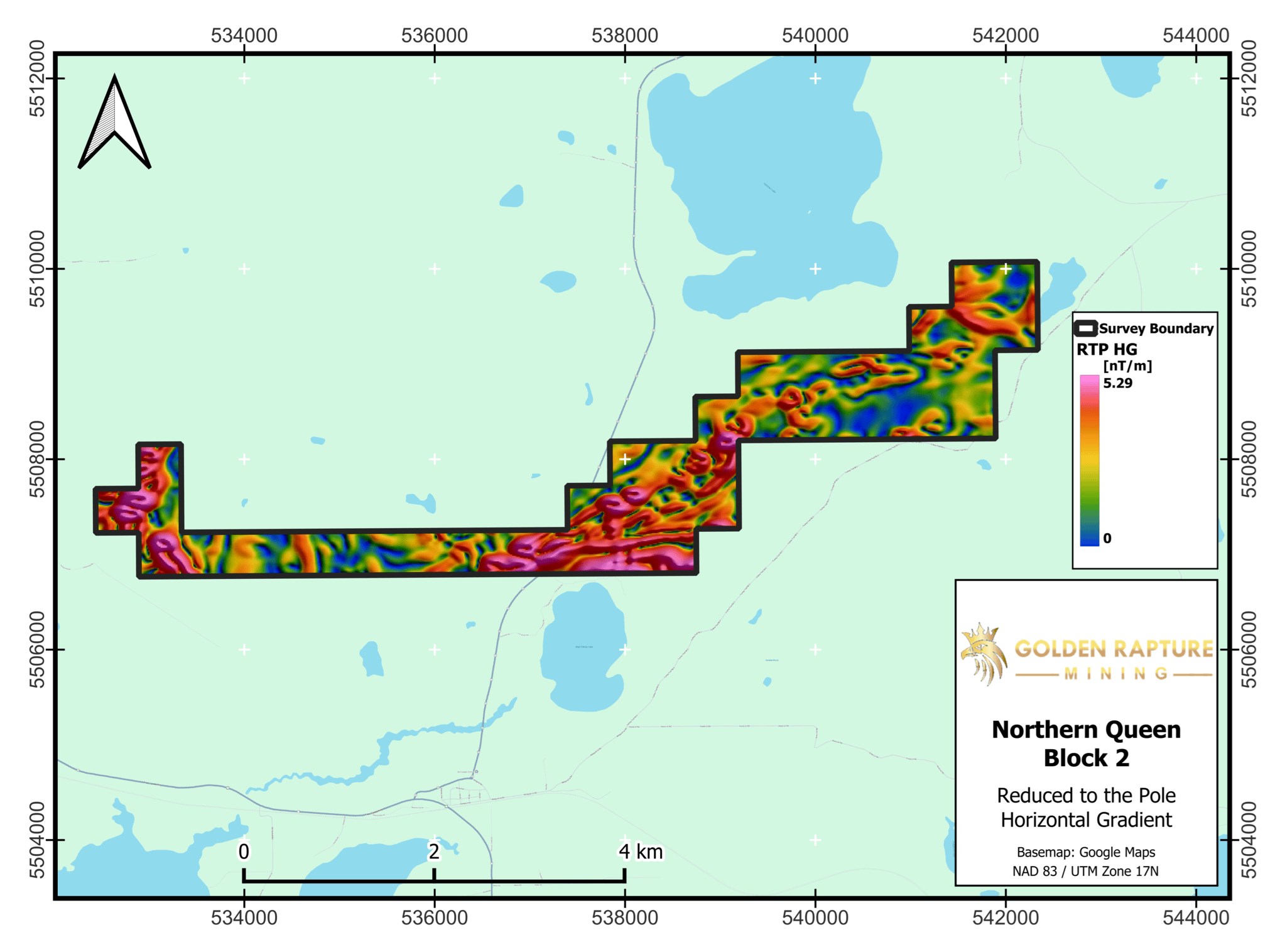 Richard Rivet said, "We are also very encouraged that the survey has also revealed a large magnetic high anomaly in the area of the historical Northern Queen Mine Shaft (Block 1), which is situated within the large Wabigoon Deformation Zone, also present on Nexgold's Goliath Deposit on our western border."
