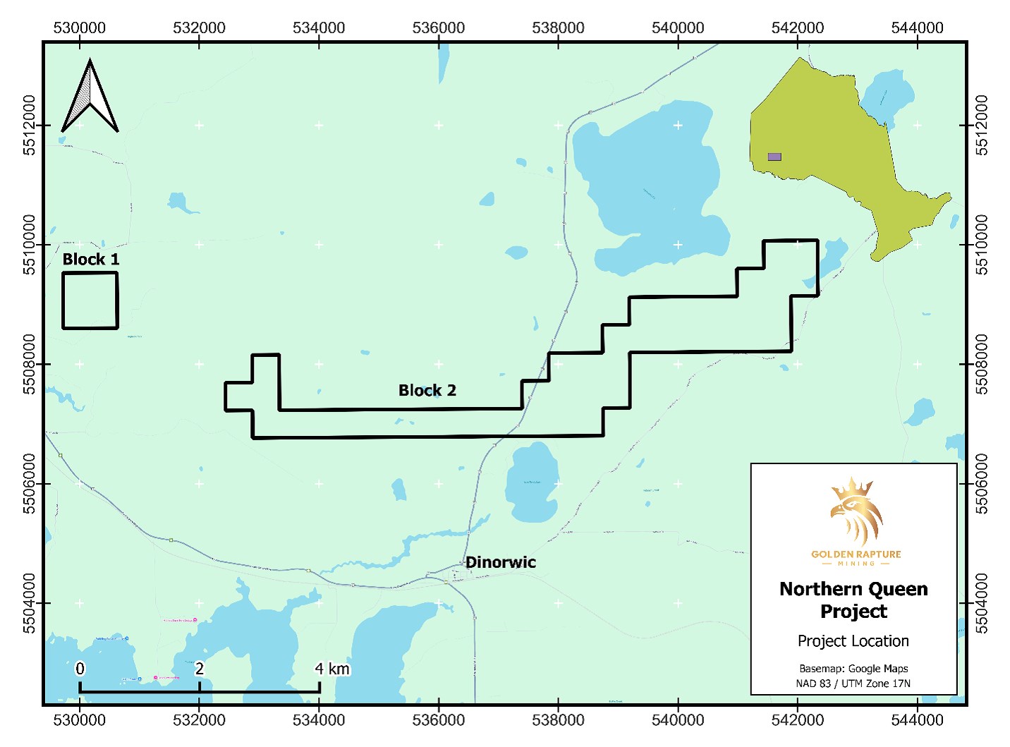 The survey comprises of two blocks with Block 1 located around 1 km from Wabigoon and Block 2 approximately 3 kms north of Dinorwic, Ontario.
