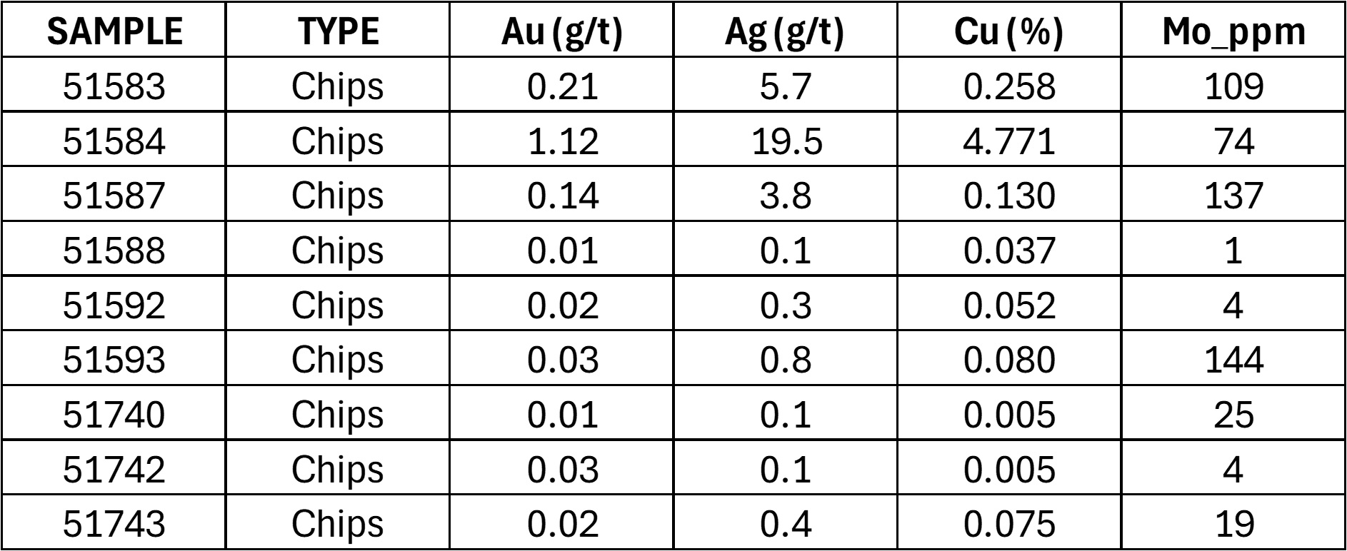 A total of nine rock chip samples were collected from mineralized outcrops. Three samples (51584, 51583 and 51587) returned encouraging results (Table 1). The best result came from sample 51584 which returned 4.77% Cu, 1.12 g/t Au, 19.5 g/t Ag, 74 ppm Mo. The samples were taken from outcropping granodiorite and hydrothermal breccias hosting Cu-porphyry–style mineralization: hydrothermal breccias with pyrite-chalcopyrite matrix, quartz-sulphide stockwork veining, and traces of bornite.