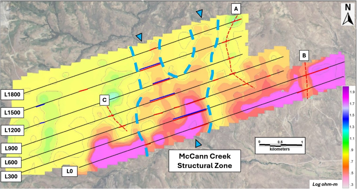 In addition to the MCSZ corridor, the CSAMT survey identified three additional alteration and structural targets, referred to as Zones A, B, and C (see Figure 2 above). These zones are interpreted from resistivity contrasts within the geophysical data that may represent: