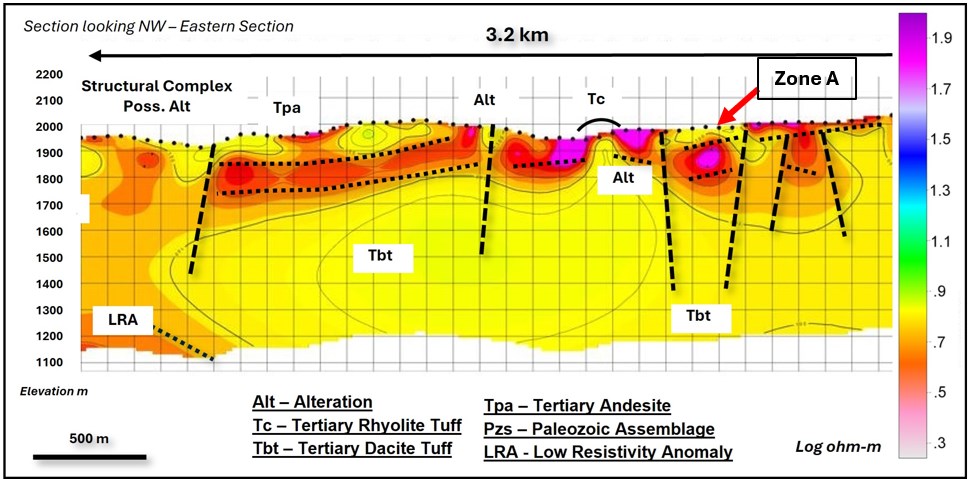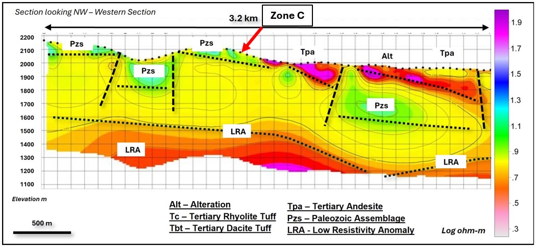 In Figure 2, Zone A was identified on Line 1800, where a strong resistivity feature occurs beneath shallow cover. This anomaly widens with depth and displays a geometry consistent with vein-style mineralization, highlighting a potentially previously unrecognized exploration target on which the Company plans to follow up. Zone A is also highlighted on the right-hand side of Figures 3 and 4 below. Zones B and C represent additional structural intersections and alteration corridors that remain largely untested, with Zone C visible on the left-hand side of Figures 3 and 5.