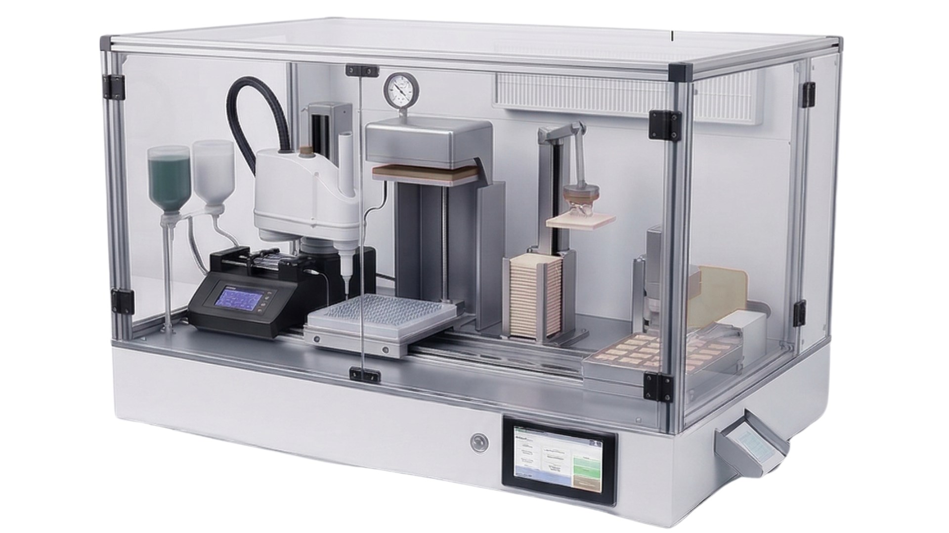 Figure 1. Prototype rendering of PatchPrint™, PharmaTher's automated tabletop microneedle patch production platform designed for end-to-end manufacturing.
