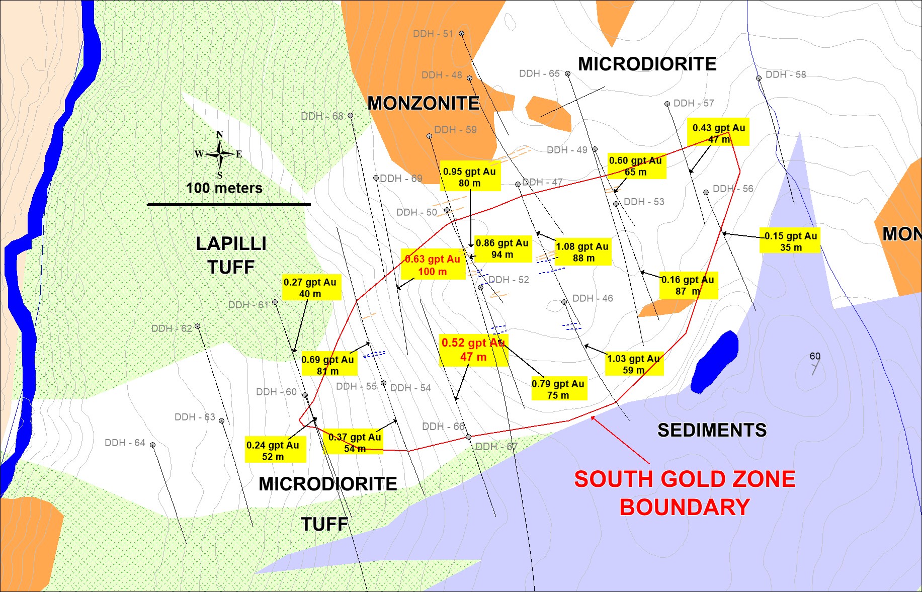 Please see the map below for drill hole locations and directions DDH 68 was located north of the Southern Gold Zone without reaching it at depth and Diamond Drill Hole 67 was collared to locate the southern boundary of gold mineralization which was intersected at about 20 metres with gold grades up to 0.299 gpt over 1.86 metres.