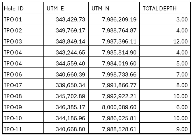 Individual borehole depths ranged from 3 metres to 12 metres, with depth of advancement controlled by ground conditions including the position of the water table, borehole stability, and the presence of resistant lateritic horizons. The deepest hole, TPO-03, reached 12 metres and exhibited a typical sequence consisting of Latosol, followed by ferruginous crust (laterite), and kamafugite-derived material to a depth 11.7 metres before intersecting the Areado Group contact. Several holes, including TPO-10 (10 metres) and TPO-11 (9 metres), similarly penetrated thick sections of the target material, with kaolin-rich zones and colour variations consistent with advanced weathering of kamafugite source rock.