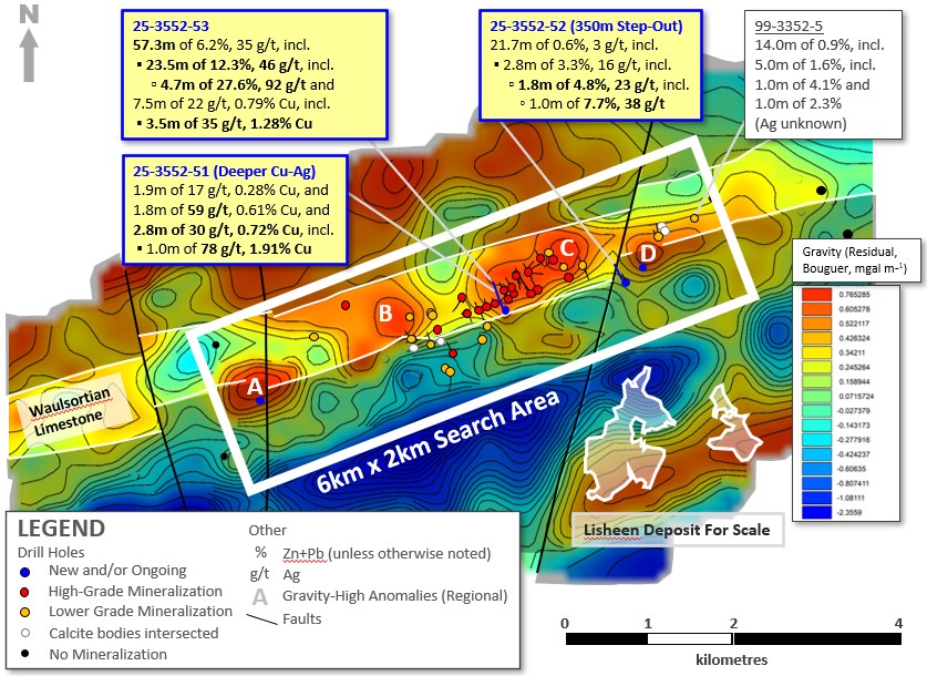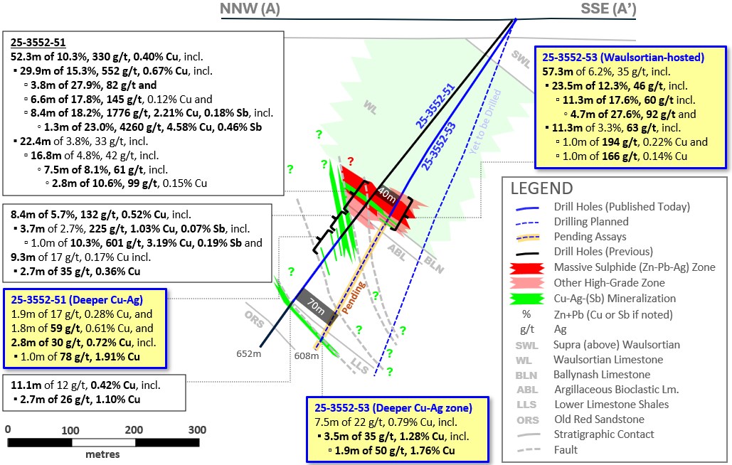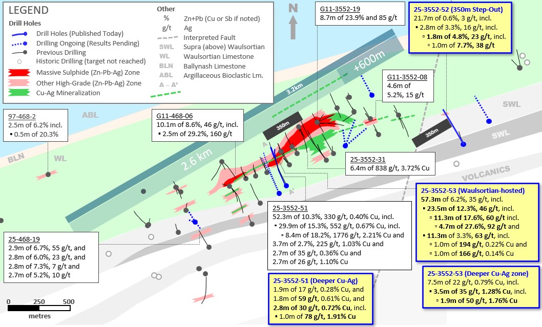 - 25-3552-53 – Extends previous interval from 25-3552-51 announced on 19-Jan-2026, totalling 29.9m of 15.3% Zn+Pb, 552 g/t Ag and 0.67% Cu (from 338m downhole, at base of Waulsortian Limestone), downdip and to the SE along two zones:
