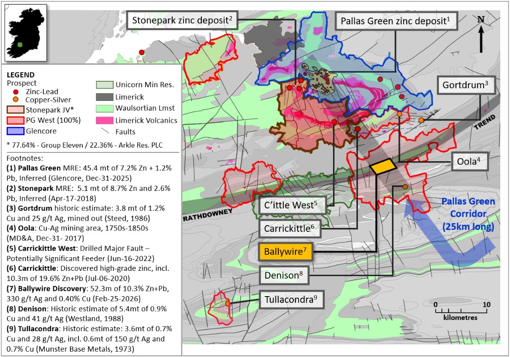 The Ballywire prospect at the Company's 100%-owned PG West Project in Republic of Ireland, represents the most significant mineral discovery in Ireland in over a decade. First announced in Sept-2022, the discovery has 77 holes drilled and reported by Group Eleven to date, including the most recent two new holes (25-3552-53 and -52) reported today. Today's results from 25-3552-51 are in addition to partial assays announced on 19-Jan-2026 and 25-Feb-2026. All of today's results are summarized above and below (see Exhibits 1 to 5).