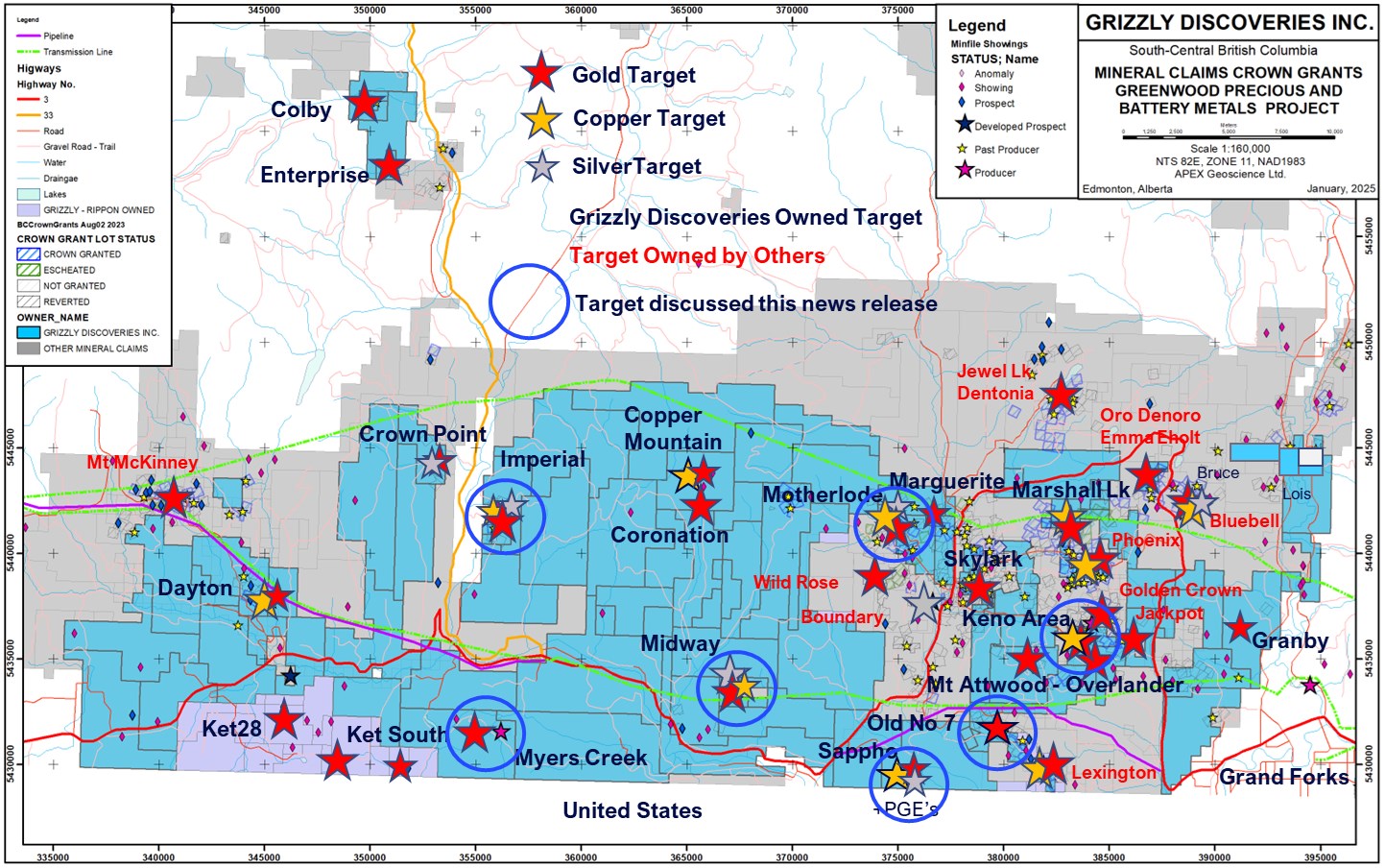 Edmonton, Alberta--(Newsfile Corp. - April 20, 2026) - Grizzly Discoveries Inc. (TSXV: GZD) (FSE: G6H) (OTCQB: GZDIF) ("Grizzly" or the "Company") is pleased to announce that it has recently received results from 2025 sampling at the Greenwood, BC Critical Minerals and Precious Metals Project from APEX Geoscience Ltd. (APEX). The collection of a total of 218 rock samples has resulted in the discovery of three new metal occurrences at the Keno area, the Old No. 7 Minesite area and at Myers Creek. Additional sampling at two other target areas that are slated for future drilling, Midway and Imperial, have confirmed grades of prior work and provided additional information on the continuity of mineralization. The targets are all part of the Greenwood Critical Minerals and Precious Metals Project in British Columbia (Figure 1).