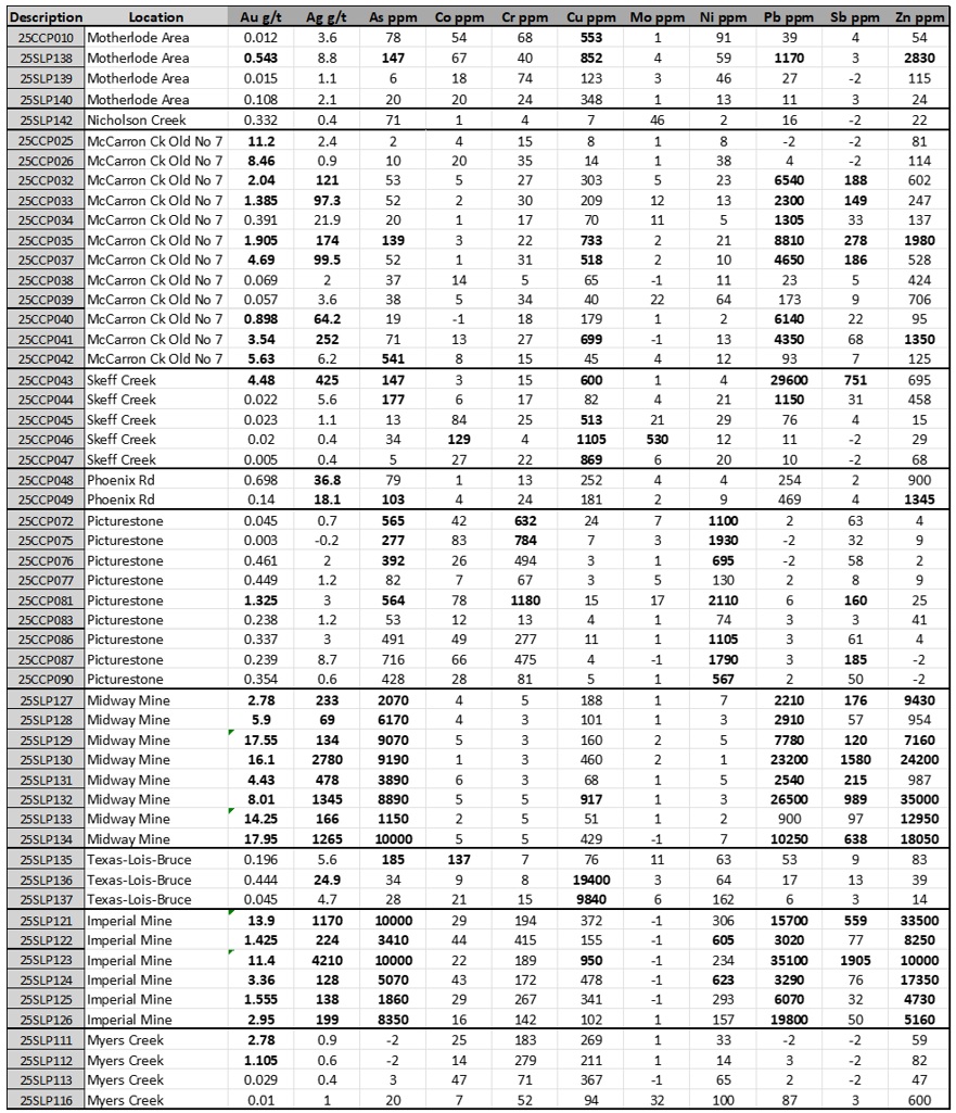 Three new Au-Cu-Ag discoveries at the Keno area, the Old No 7. Mine area and at Myers Creek area (Figure 1). Additional 2025 sampling at the historical Midway and Imperial mines continues to return outstanding results, and reinforces that both targets warrant drilling.