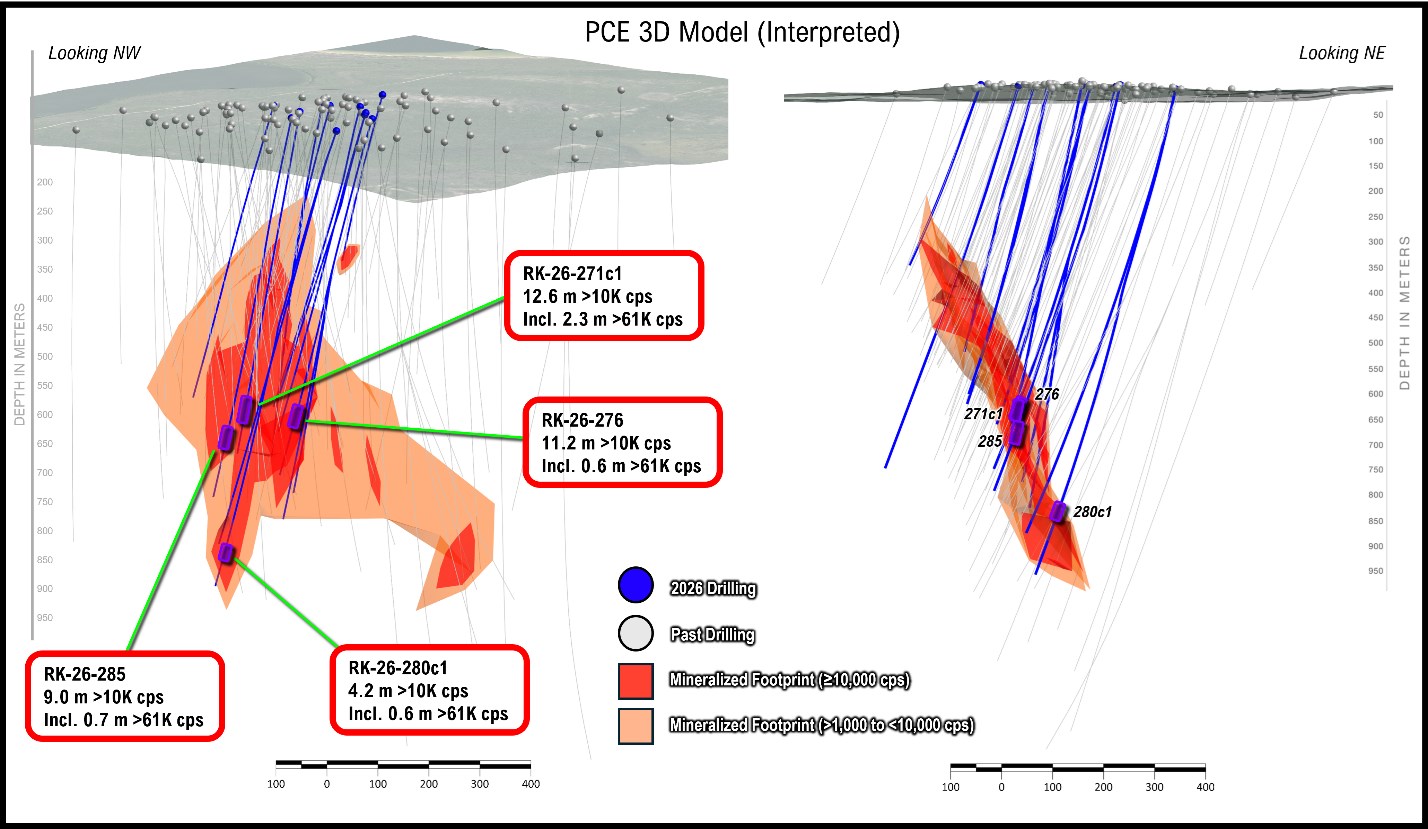 Within the mineralized zone of PCE, the high-grade subdomain has now grown to 550 m in vertical extent, a 33% increase, with a strike length of 210 m. This expansion was primarily driven by hole RK-26-280c1 which returned cumulative 4.2m of >10,000 cps including 0.6m of >61,000 cps at 834m below surface (Figures 1-3). The hole successfully intersected mineralization 230m down plunge along a high-grade shoot interpreted to connect with RK-26-271c1 (Figure 4).