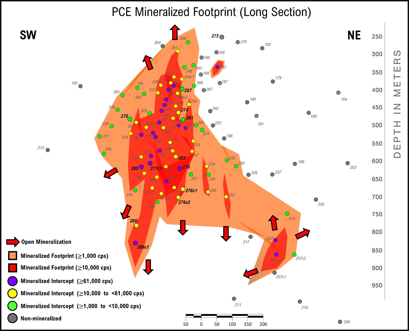 Figure 2: Interpreted model of mineralization at PCE (as of this release); new holes emphasized by larger diameter pierce points and bold labels; view is a long section that looks perpendicular to the primary mineralized plane; total mineralized footprint in orange and the high-grade subdomains in red