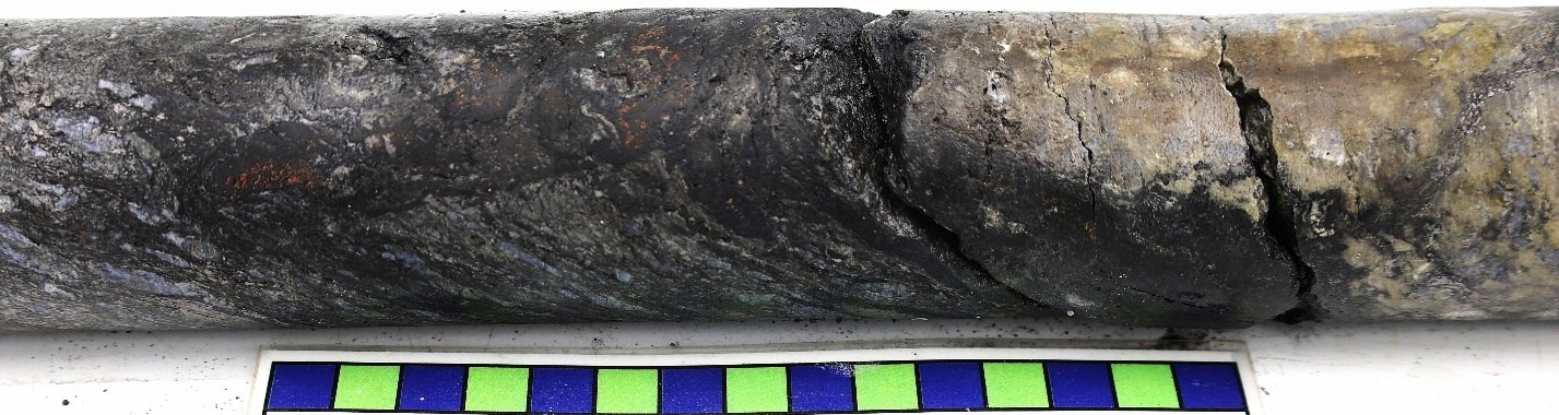 Figure 3: Core photo from RK-25-280c1 displays semi-massive, off-scale (>61,000 cps) from uranium vein at 834m down hole