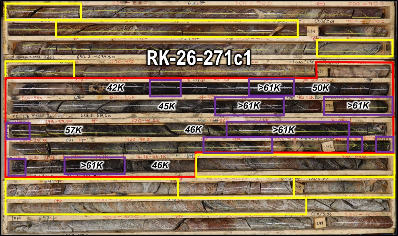 - High-grade extension in RK-26-280c1 with cumulative 4.2m of >10,000 cps including 0.6m of >61,000 cps