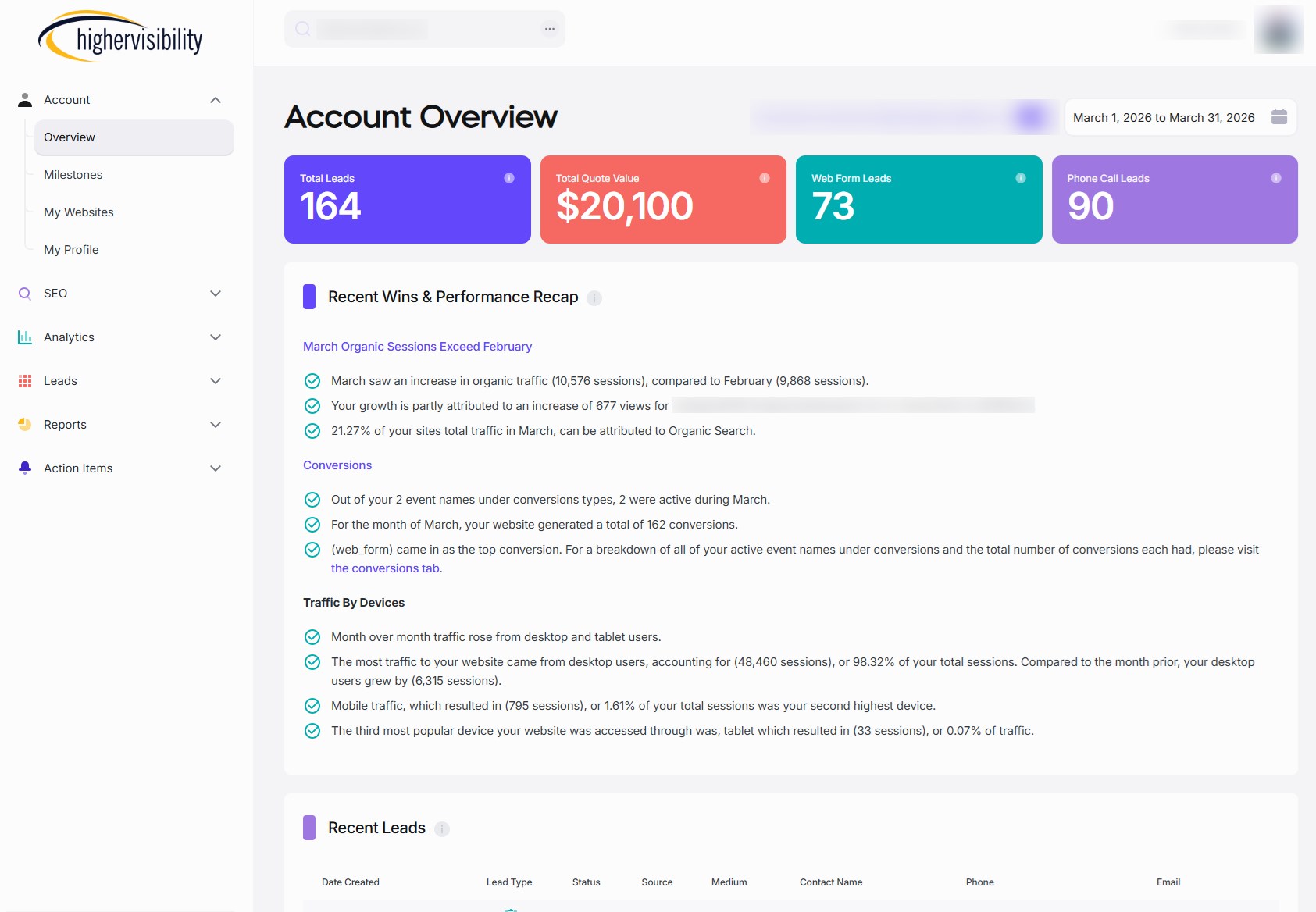 Insite is used by HigherVisibility clients to track marketing performance across channels, including SEO, paid media, and web analytics. The rebuild addresses long-standing limitations in speed and interface design, while preparing the platform for expanded functionality.