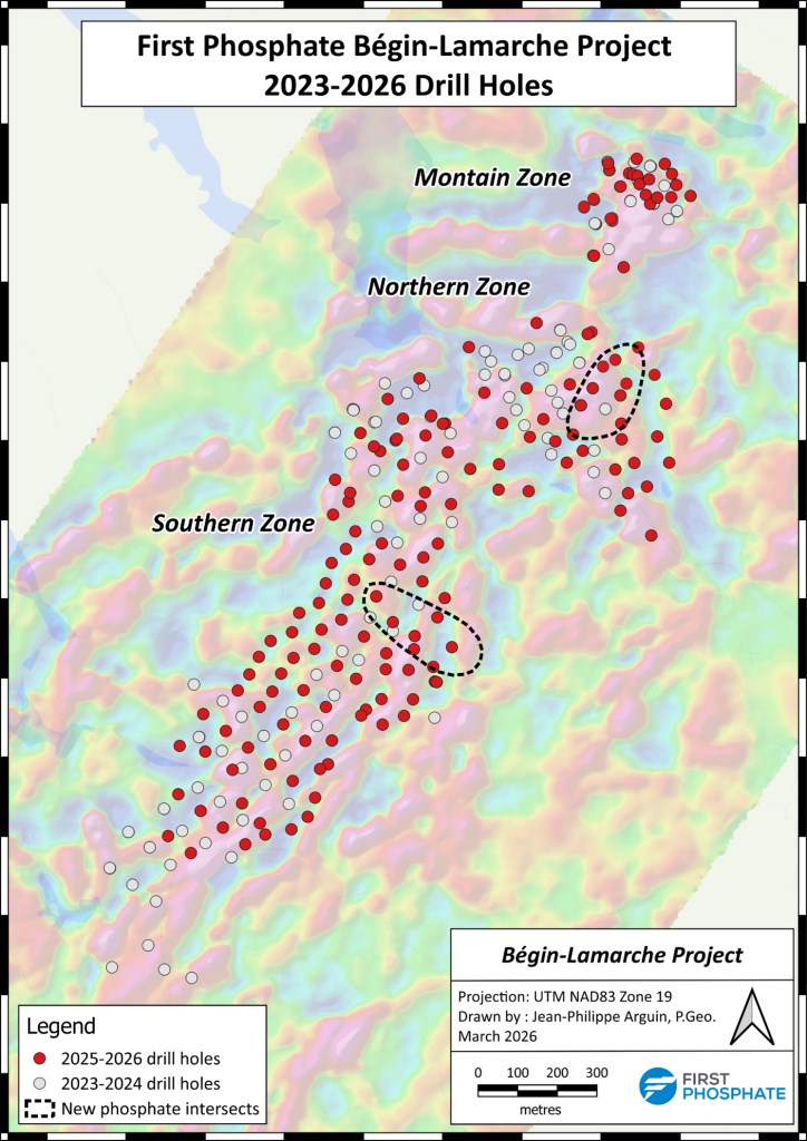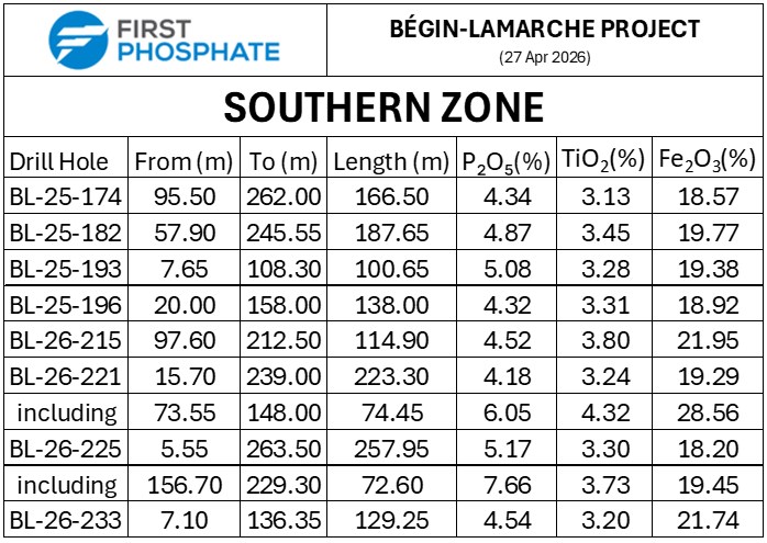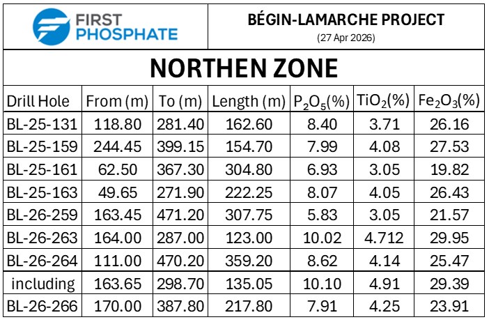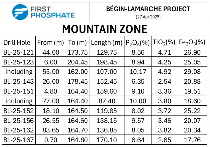 Saguenay-Lac-Saint-Jean, Québec--(Newsfile Corp. - April 27, 2026) - First Phosphate Corp. (CSE: PHOS) (OTCQX: FRSPF) (OTCQX ADR: FPHOY) (FSE: KD0) ("First Phosphate" or the "Company") is pleased to announce analytical results for its infill drill program, completed on March 31, 2026, at its Bégin-Lamarche property in Saguenay-Lac-Saint-Jean, Québec, Canada.