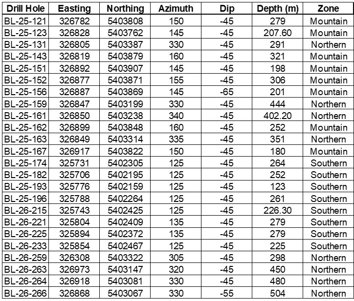 Parameters for the Current Drill Holes Being Released (2025-2026)