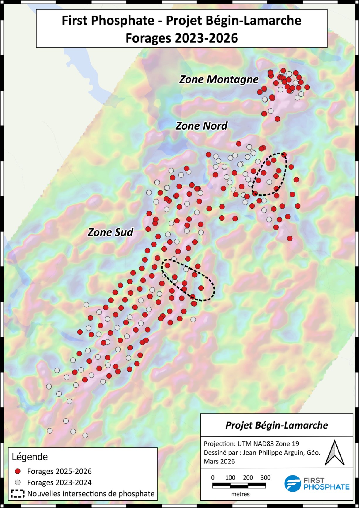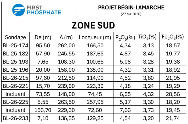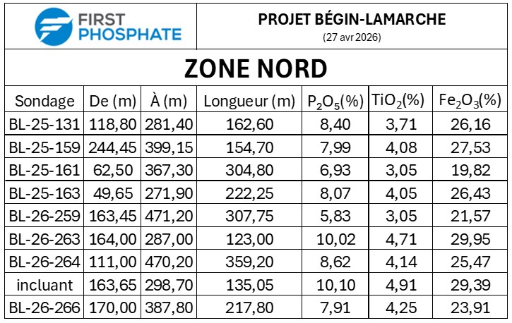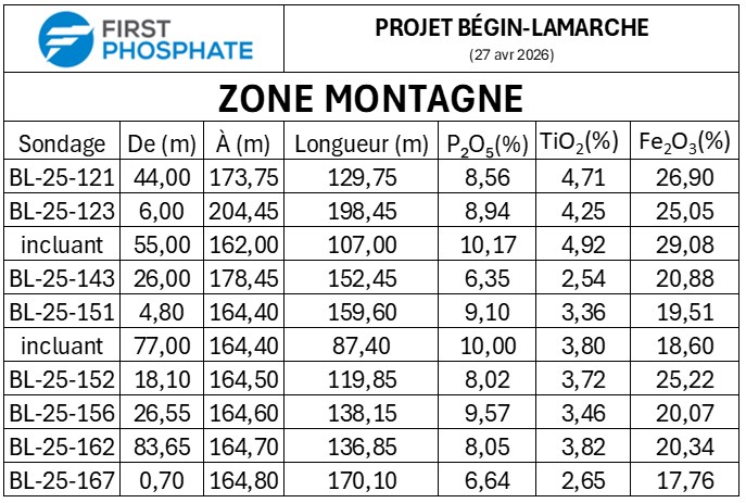 Saguenay-Lac-Saint-Jean, Québec--(Newsfile Corp. - 27 avril 2026) - First Phosphate Corp. (CSE: PHOS) (OTCQX: FRSPF) (OTCQX ADR: FPHOY) (FSE: KD0) (« First Phosphate » ou la « Société ») a le plaisir d'annoncer les résultats analytiques de son programme de forage intercalaire, complété le 31 mars 2026, sur sa propriété Bégin-Lamarche au Saguenay-Lac-Saint-Jean, Québec, Canada.