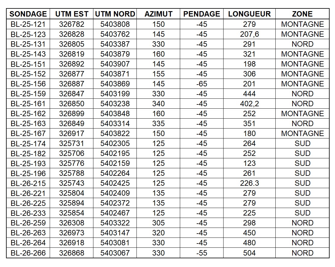 Veuillez noter que les intersections rapportées dans le présent communiqué représentent des longueurs de carottes forées. Les largeurs vraies sont estimées à plus de 70 %.
