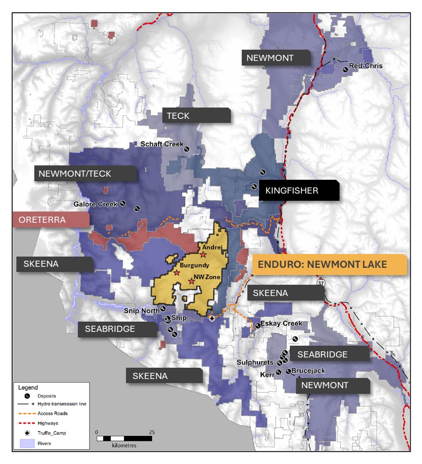 The Newmont Lake Project is one of the largest contiguous claim packages (688 square km) in the Golden Triangle and is strategically located near major porphyry copper-gold (Cu-Au) development projects, including Galore Creek (Newmont - Teck Resources) and KSM (Seabridge Gold), as well as past-producing high grade gold mines at Snip and Eskay Creek (currently being put back into production by Skeena Gold & Silver). The project encompasses five large target areas that include the partially drill-tested Burgundy Ridge alkalic-style porphyry copper-gold deposit (331 m @ 0.29% Cu and 0.29 g/t gold in hole 21-001, see news release dated October 18, 2021 for QA/QC details); the newly outlined and undrilled Andrei porphyry copper-gold target, a greater than 4 km long chargeability and magnetic anomaly wherein 25% of rock samples collected in 2025 exceeded 0.1% copper (see news release dated January 28, 2026 for detailed QA/QC) and; the McLymont gold target, a 20 km2 area that includes the NW Zone, host to a historical gold resource and where Enduro sampling in 2025 returned high-grade gold values from narrow sub-meter quartz pyrite veins within shear zones of up to 113 g/t Au with142 g/t Ag (see news release dated January 8, 2026 for detailed QA/QC).