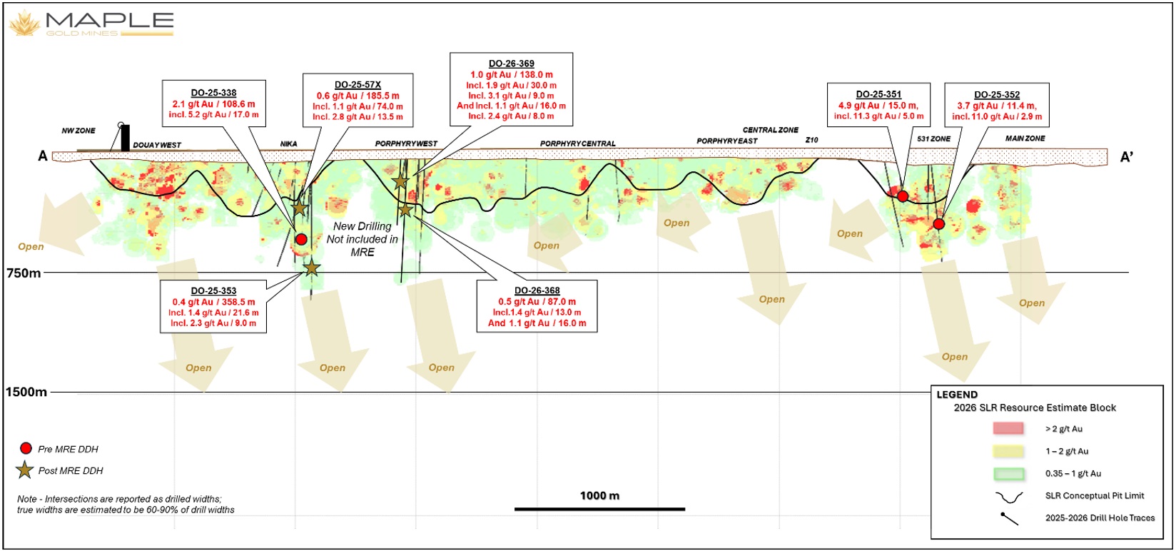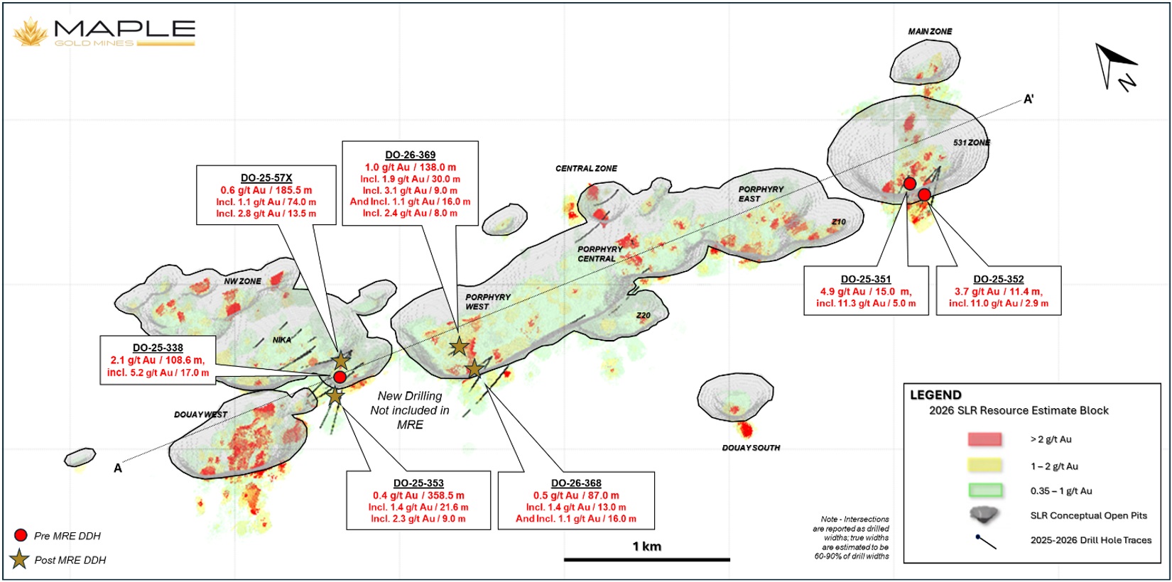Vancouver, British Columbia--(Newsfile Corp. - April 27, 2026) - Maple Gold Mines Ltd. (TSXV: MGM) (OTCQX: MGMLF) (FSE: M3G0) ("Maple Gold" or the "Company") is pleased to announce a significant update to the independent Mineral Resource Estimate ("2026 MRE") at its 100%-owned Douay Gold Project ("Douay") and Joutel Gold Project ("Joutel") (together, "Douay/Joutel" or the "Project"), further establishing Douay/Joutel as a growing, district-scale gold project in Québec's Abitibi region. Pit-constrained and underground Mineral Resources at Douay have both increased along with further conversion from Inferred to Indicated Mineral Resource categories based on successful exploration and infill drilling between October 2021 and November 2025, comprehensive mineralization modeling, and using higher cost and gold price assumptions compared to the 2022 MRE1. The 2026 MRE also includes a maiden high-grade underground Mineral Resource at Joutel, which hosts the past-producing, high-grade Joutel Mining Complex2.