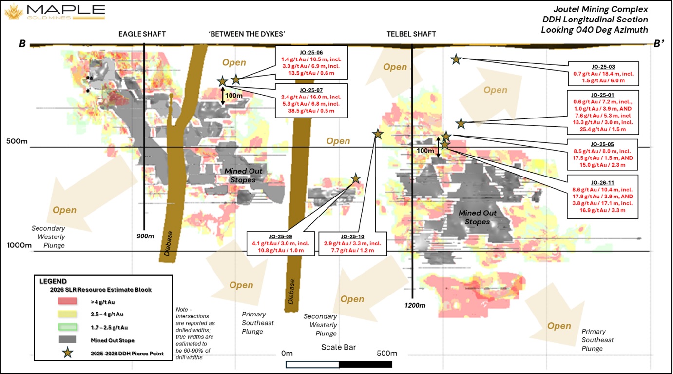 Figure 3: Joutel longitudinal section showing historical Eagle-Telbel underground workings and mined-out stopes, 2026 MRE block model, and selected drilling results not included in the 2026 MRE
