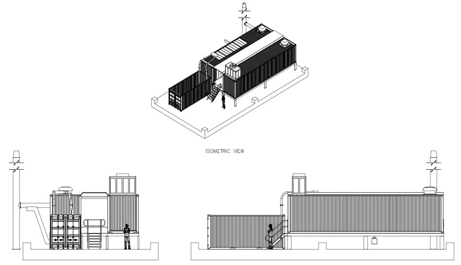 Isometric and elevation views of the modular Dockmaster unit planned for the UK deployment.