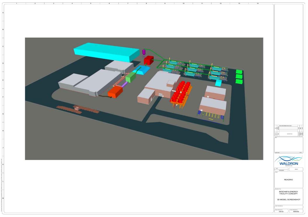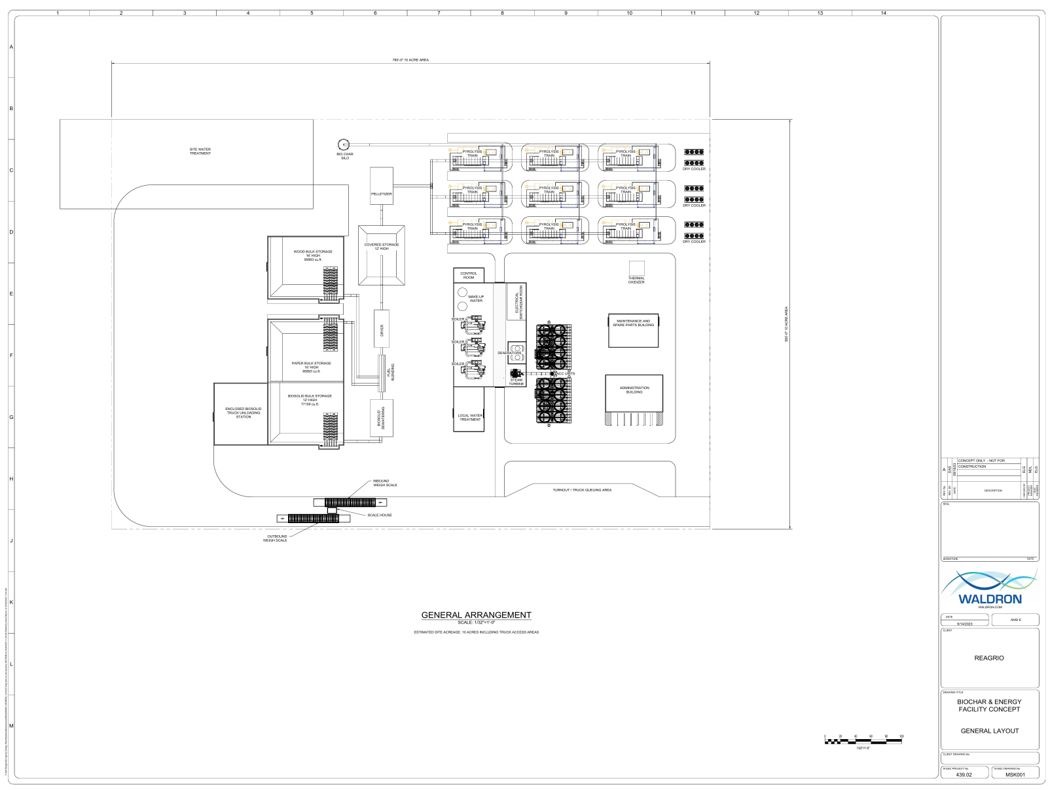 Conceptual site plan, Project 439.02 — Waldron Engineering & Construction. 12-unit pyrolysis train layout with feedstock handling, water treatment, and balance-of-plant infrastructure.