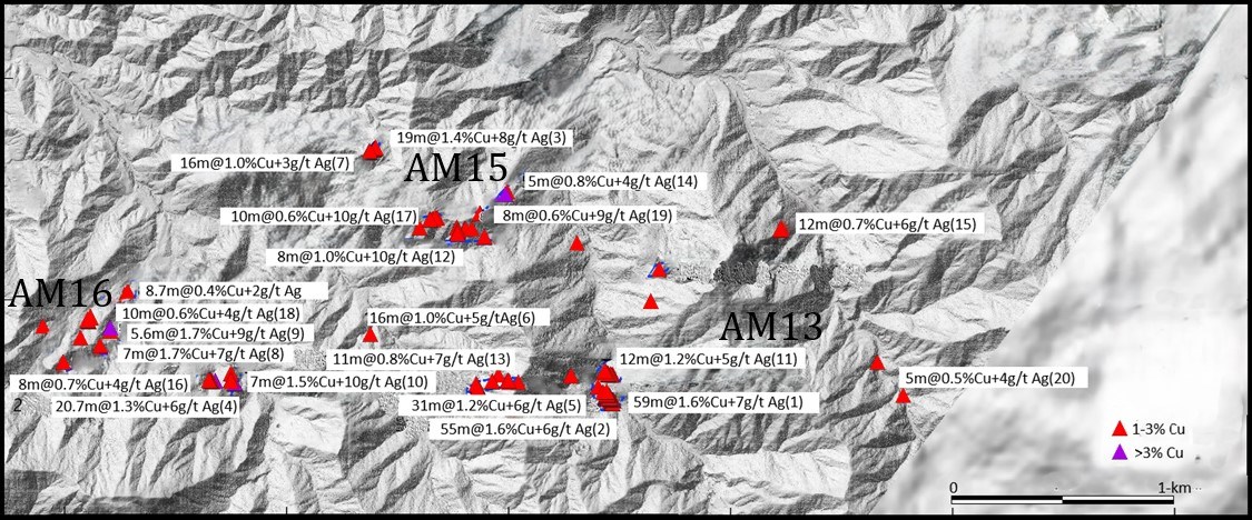 1.4% copper & 8 g/t silver over 19.0m, AM15(3) continuous chip channel