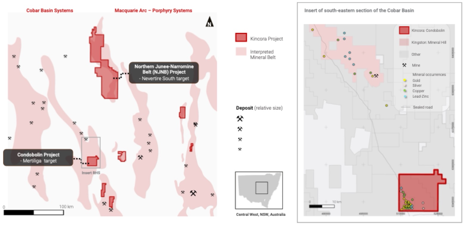 Figure 1: Kincora is currently sole-funding drilling at the Condobolin Mining Field while AngloGold Ashanti funds drilling (with Kincora receiving a management fee) at the Nevertire South license which is part of two earn-ins within the Northern Junee-Narromine Belt project